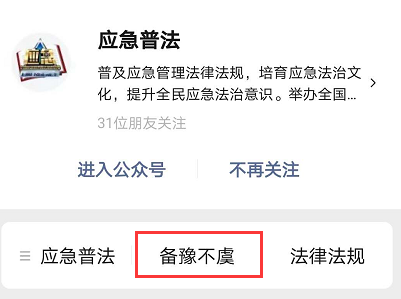 1.用微信掃一掃應(yīng)急普法微信公眾號(hào)并關(guān)注,打開頁面下方備豫不虞欄目,登記注冊(cè)個(gè)人資料,特別提醒,在填寫個(gè)人所屬地區(qū)時(shí),選擇“廣東省汕尾市”;