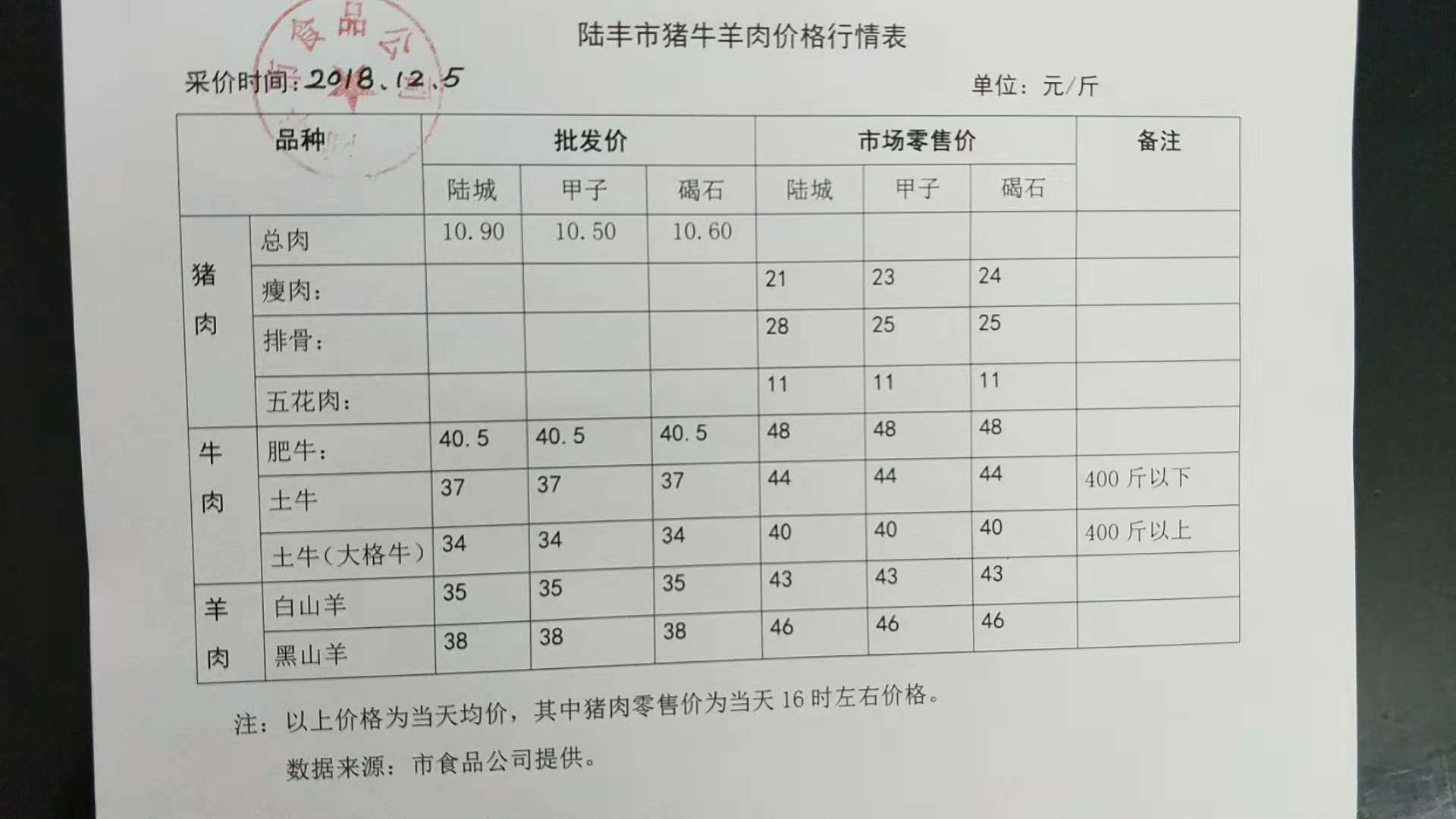 陸豐市豬牛羊肉價(jià)格行情表(2018年12月5日)