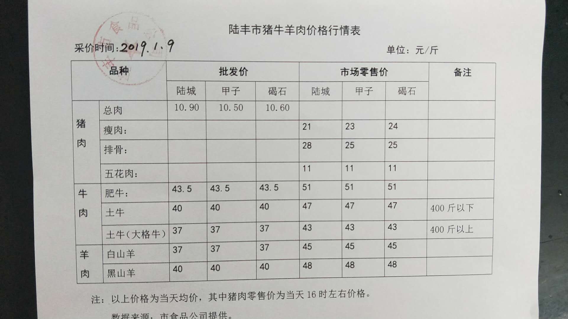 陸豐市豬牛羊肉價格行情表(2019年1月9日)