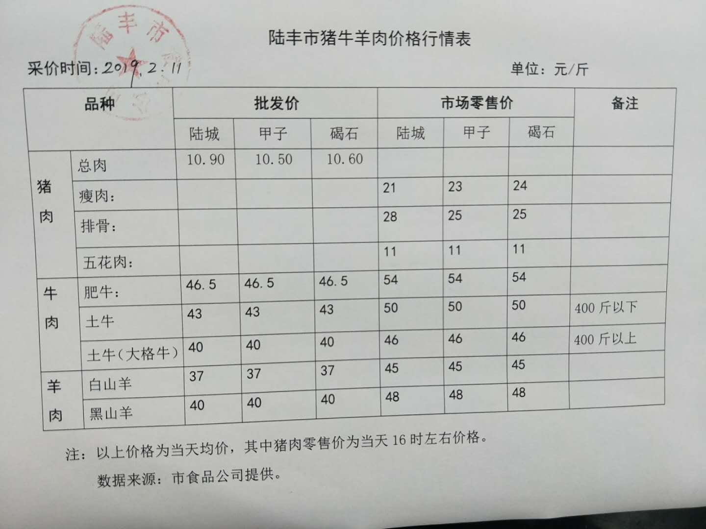 陸豐市豬牛羊肉價(jià)格行情表(2019年2月11日)