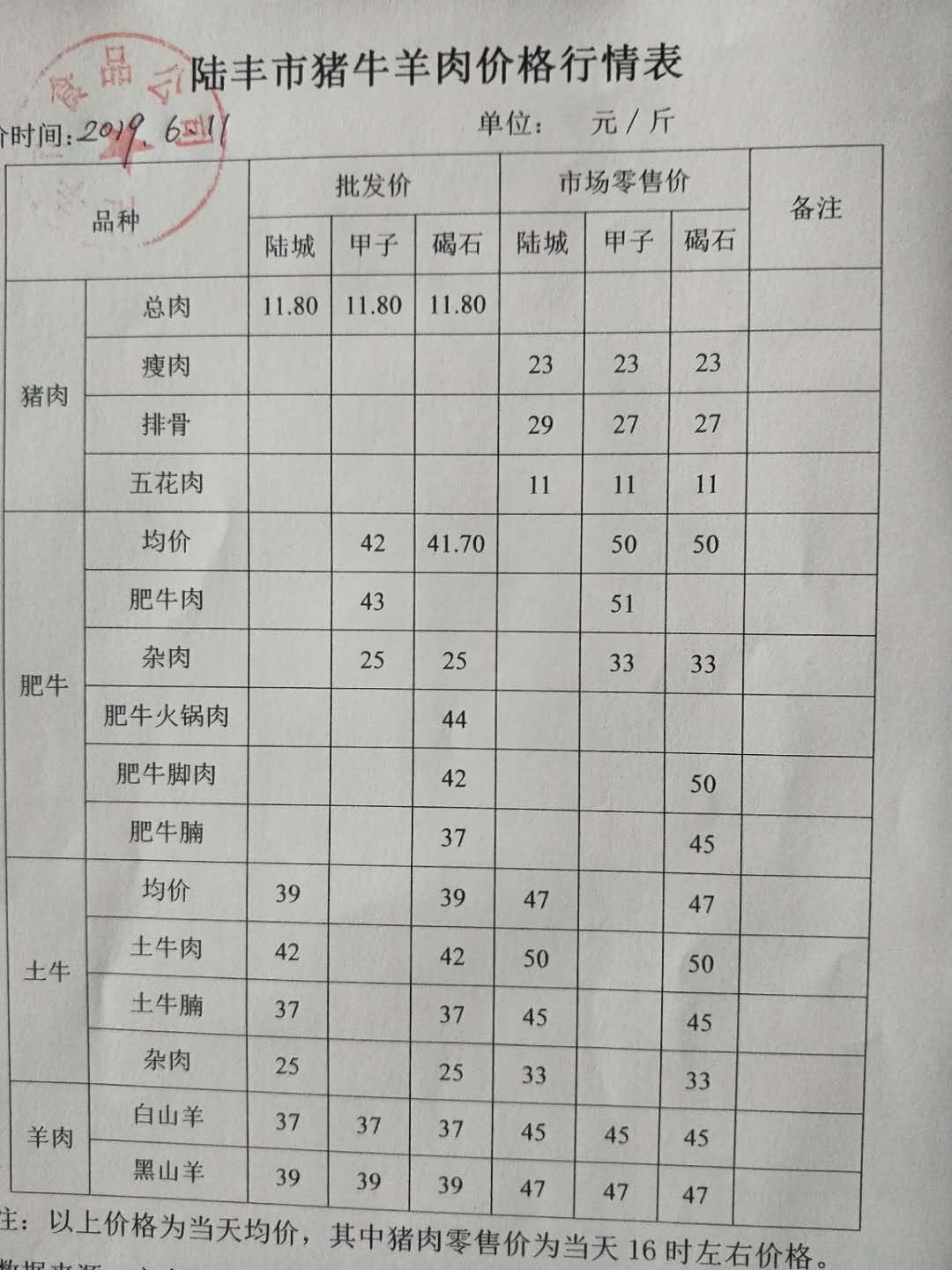 陸豐市豬牛羊價(jià)格行情表(2019年6月11日)