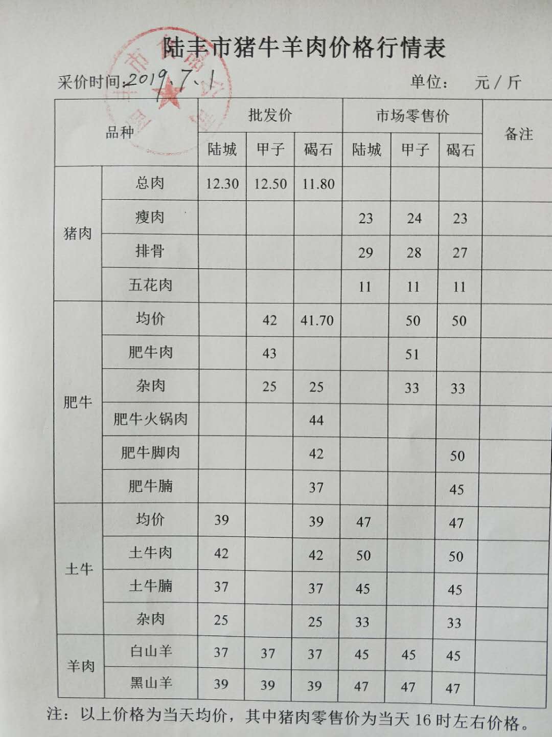 陸豐市豬牛羊價格行情表(2019年7月1日)