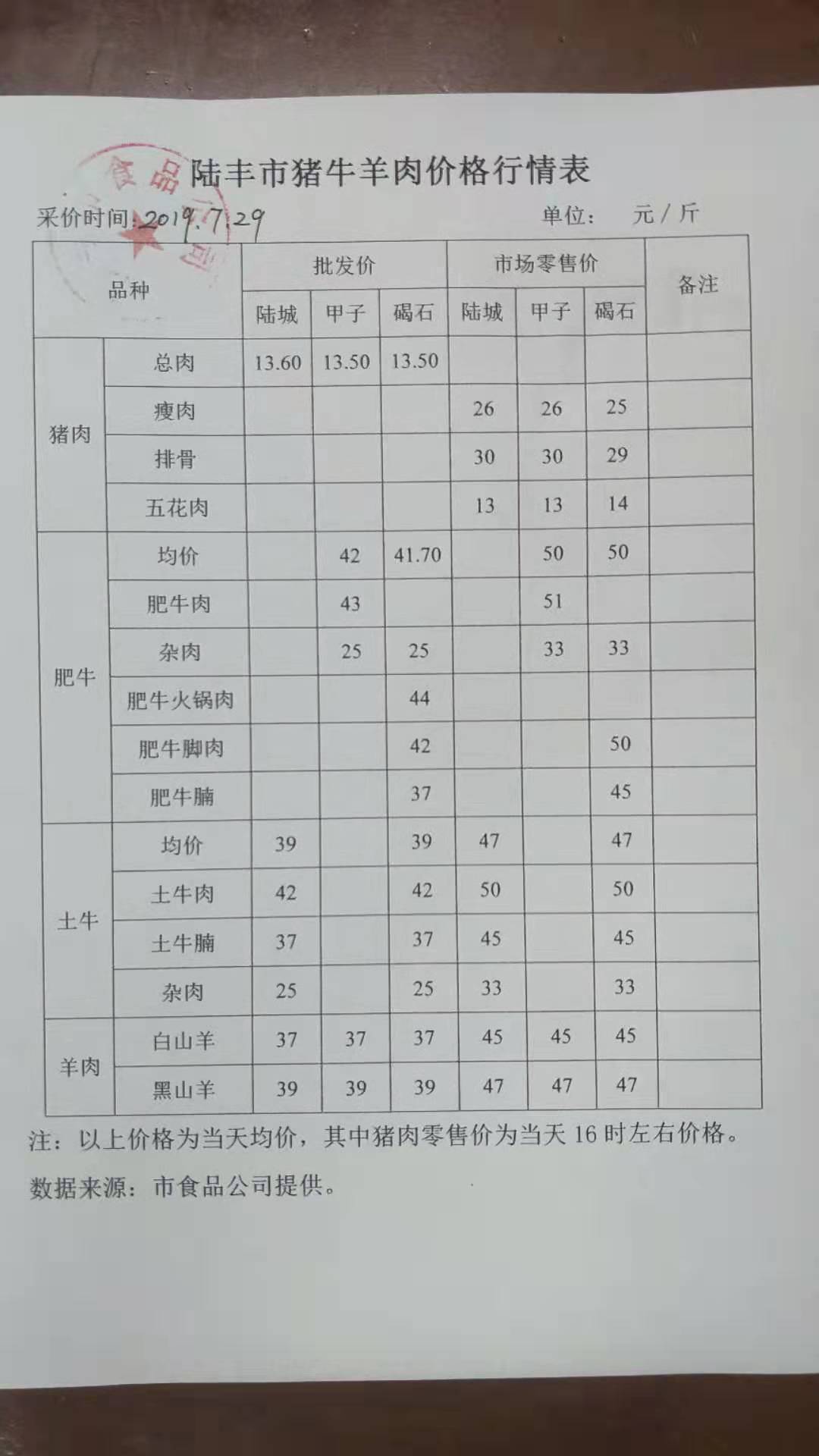 陸豐市豬牛羊肉價格行情表(2019年7月29日)