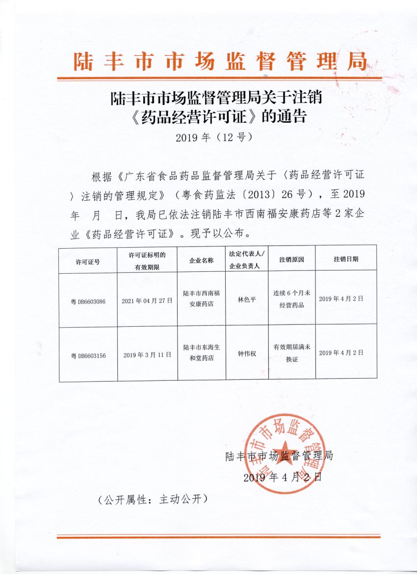 關于注銷《藥品經(jīng)營許可證》的通告(2019年12號)