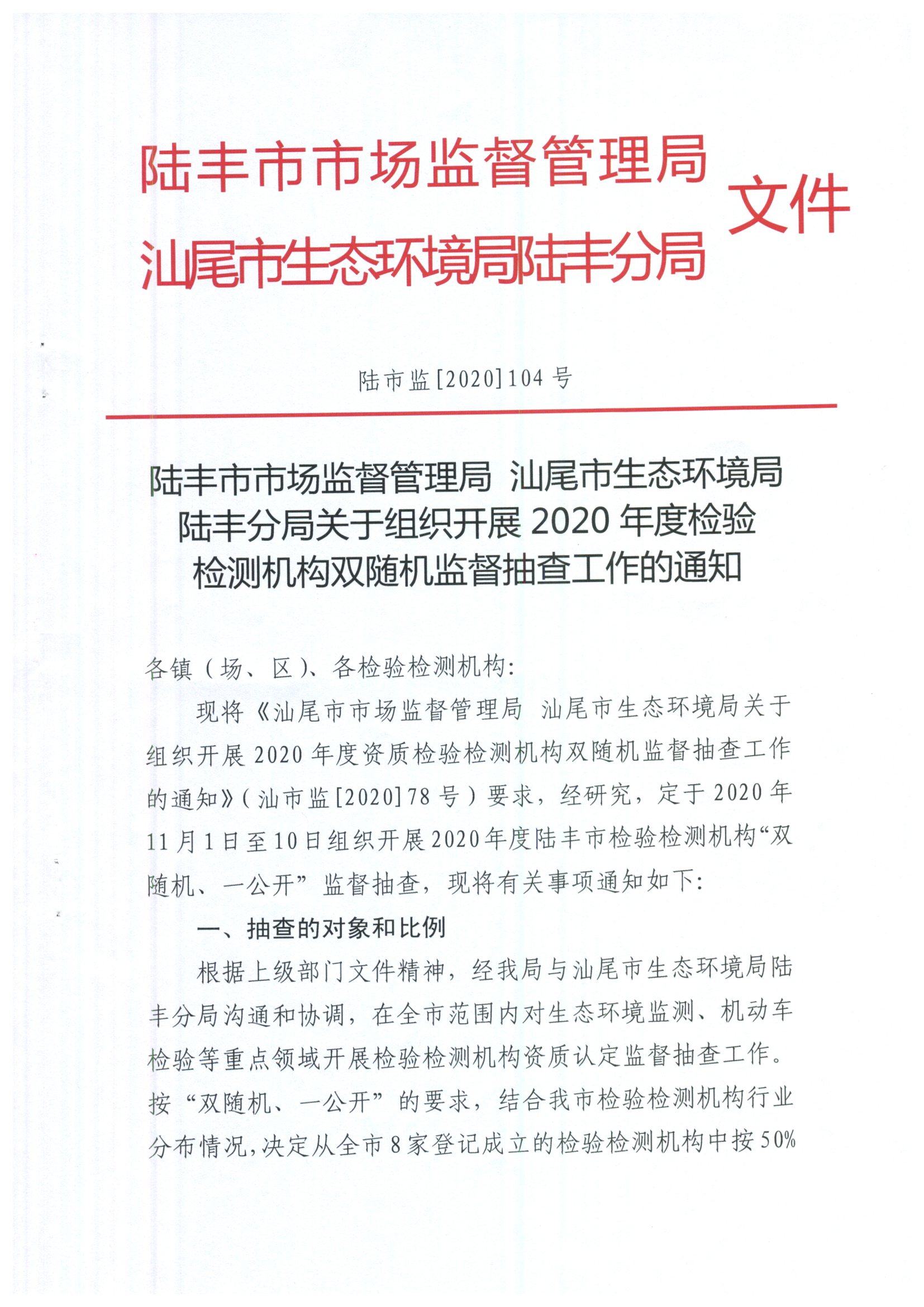 關(guān)于組織開展2020年度檢驗(yàn)檢測(cè)機(jī)構(gòu)雙隨機(jī)監(jiān)督抽查工作的通知