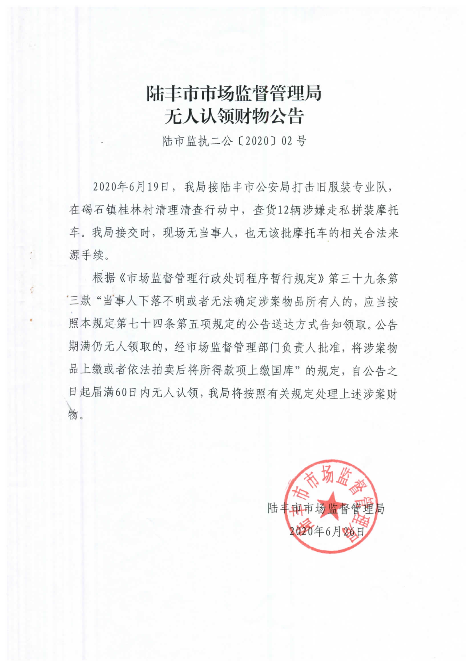 陸豐市市場(chǎng)監(jiān)督管理局無人認(rèn)領(lǐng)財(cái)物公告