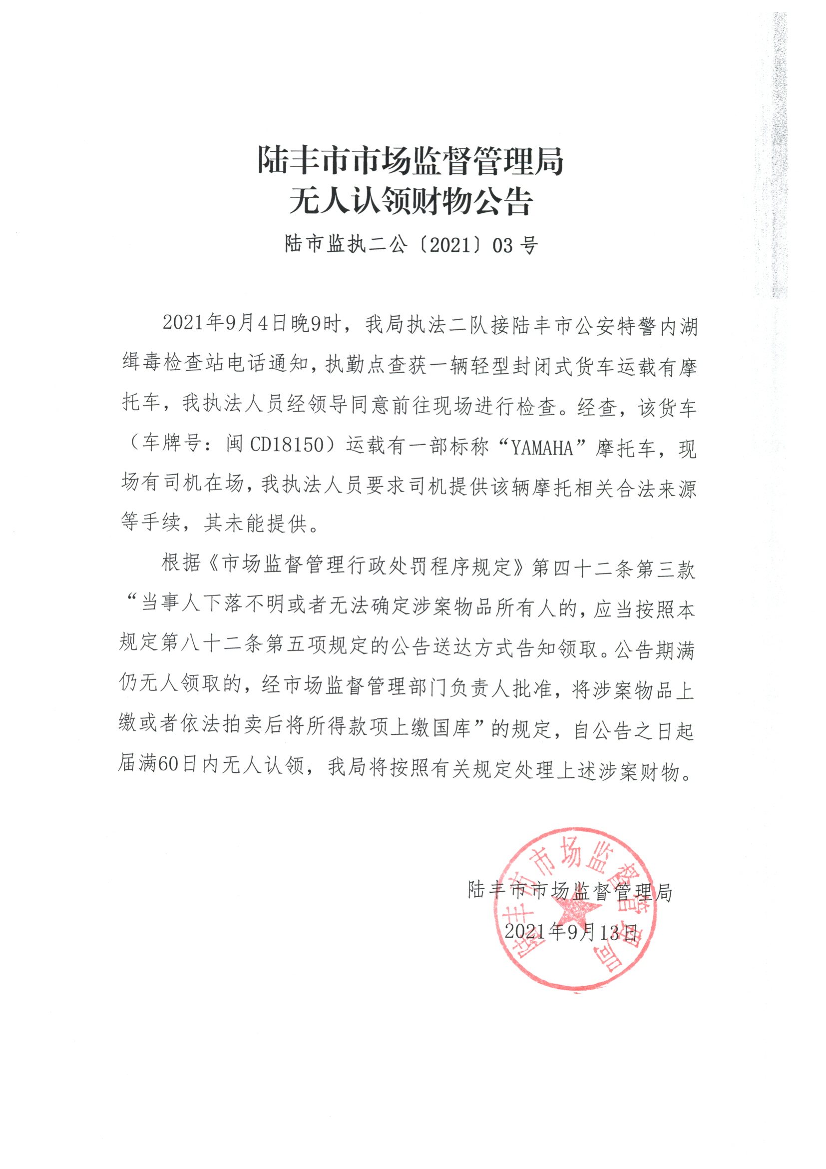 陸豐市市場監(jiān)督管理局無人認(rèn)領(lǐng)財(cái)物公告