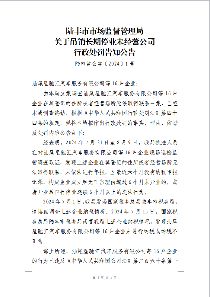 陸豐市市場監(jiān)督管理局關(guān)于吊銷長期停業(yè)未經(jīng)營公司行政處罰告知公告