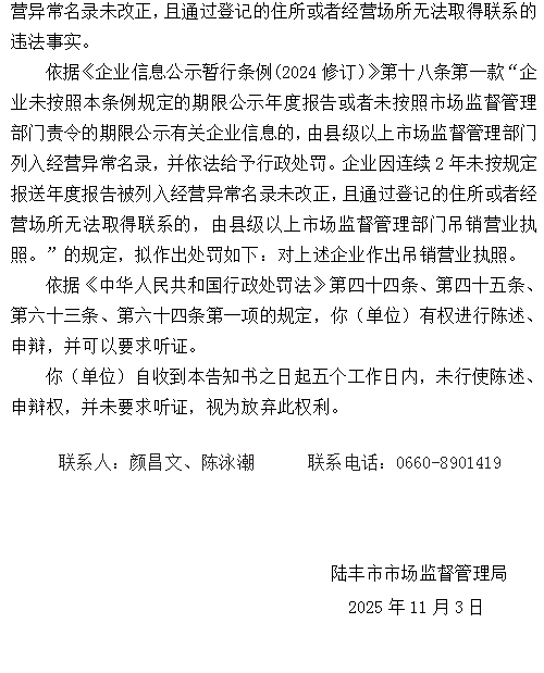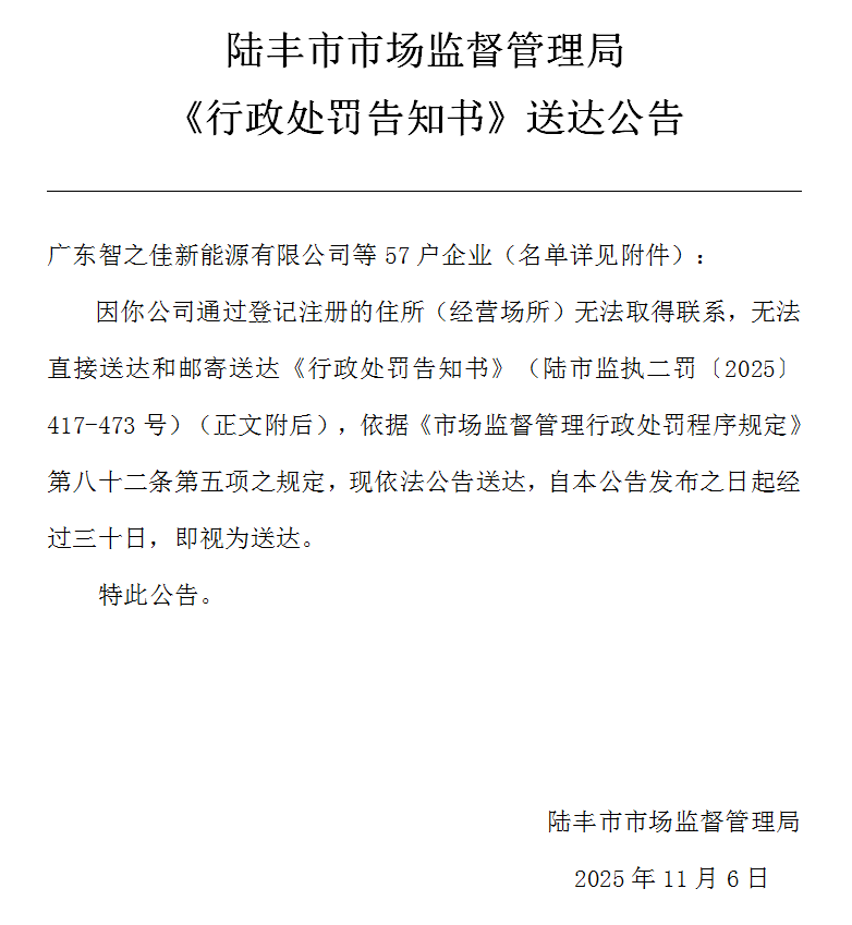 陸豐市市場(chǎng)監(jiān)督管理局《行政處罰告知書》送達(dá)公告