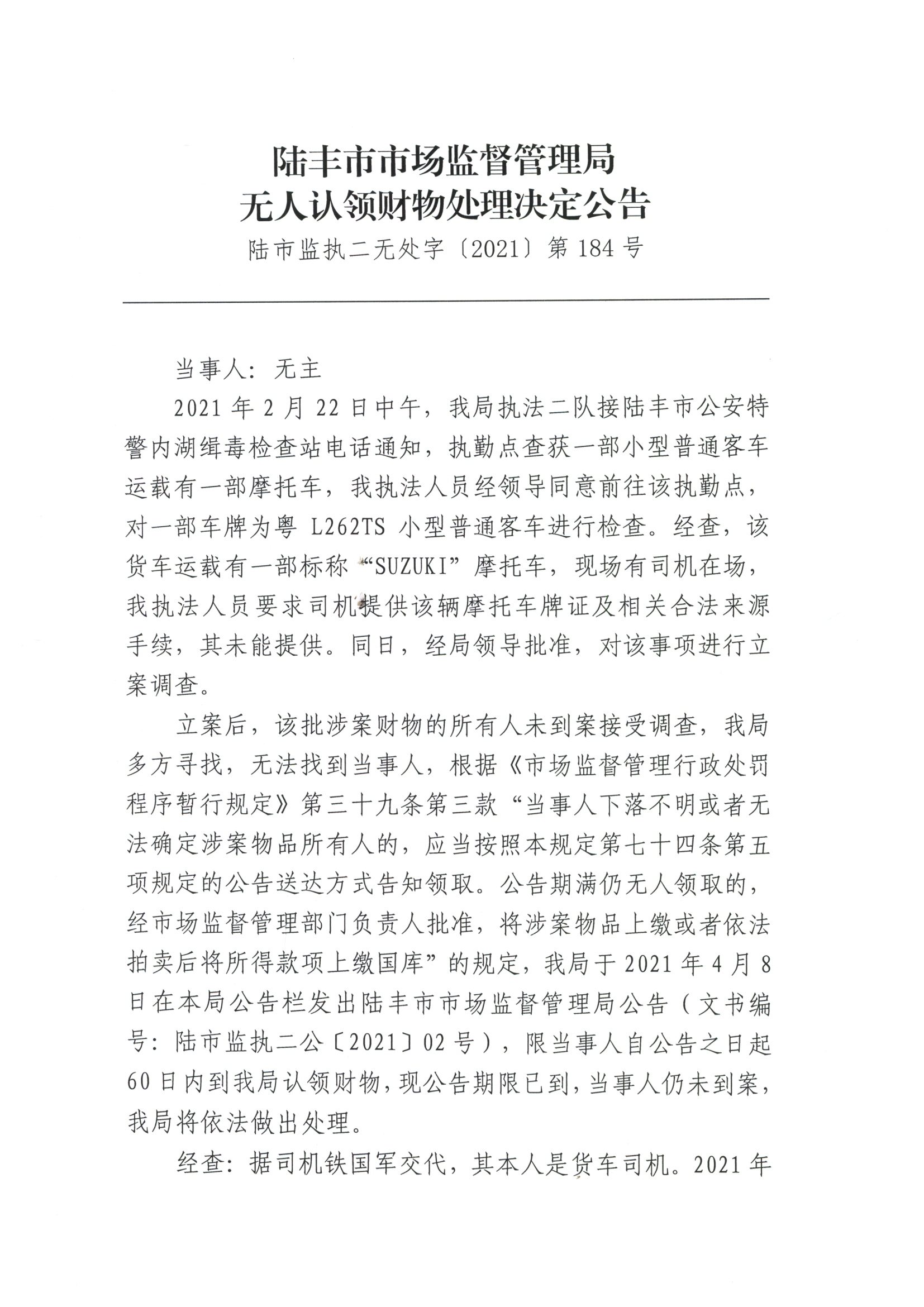 陸豐市市場(chǎng)監(jiān)督管理局無人認(rèn)領(lǐng)財(cái)物處理決定公告