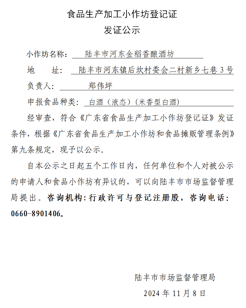 經(jīng)審查,陸豐市河?xùn)|金稻香釀酒坊符合《廣東省食品生產(chǎn)加工小作坊登記證》發(fā)證條件,根據(jù)《廣東省食品生產(chǎn)加工小作坊和食品攤販管理條例》第九條規(guī)定,現(xiàn)予以公示。