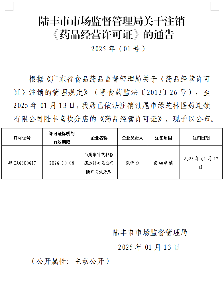 陸豐市市場監(jiān)督管理局關于注銷《藥品經(jīng)營許可證》的通告