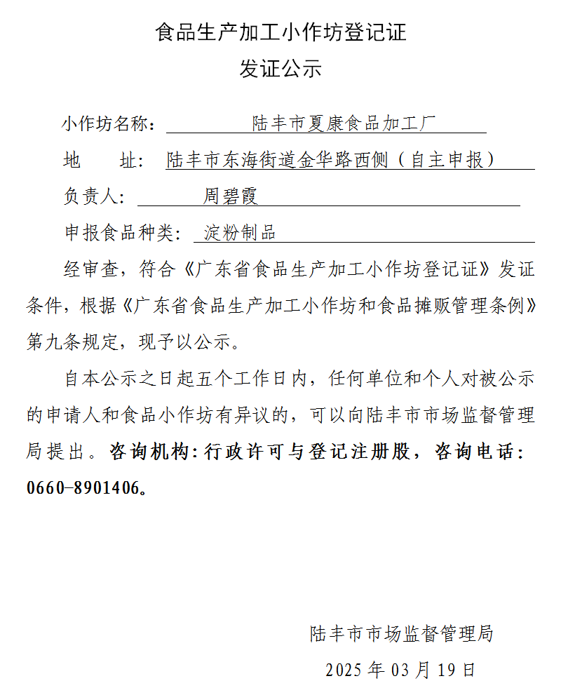 經審查,陸豐市夏康食品加工廠符合《廣東省食品生產加工小作坊登記證》發(fā)證條件,根據《廣東省食品生產加工小作坊和食品攤販管理條例》第九條規(guī)定,現予以公示。