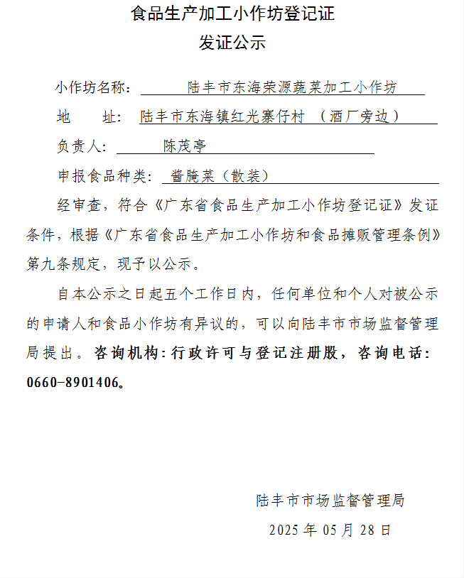 經(jīng)審查,陸豐市東海榮源蔬菜加工小作坊符合《廣東省食品生產(chǎn)加工小作坊登記證》發(fā)證條件,根據(jù)《廣東省食品生產(chǎn)加工小作坊和食品攤販管理?xiàng)l例》第九條規(guī)定,現(xiàn)予以公示。