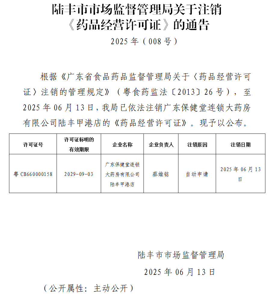 陸豐市市場(chǎng)監(jiān)督管理局關(guān)于注銷《藥品經(jīng)營(yíng)許可證》的通告