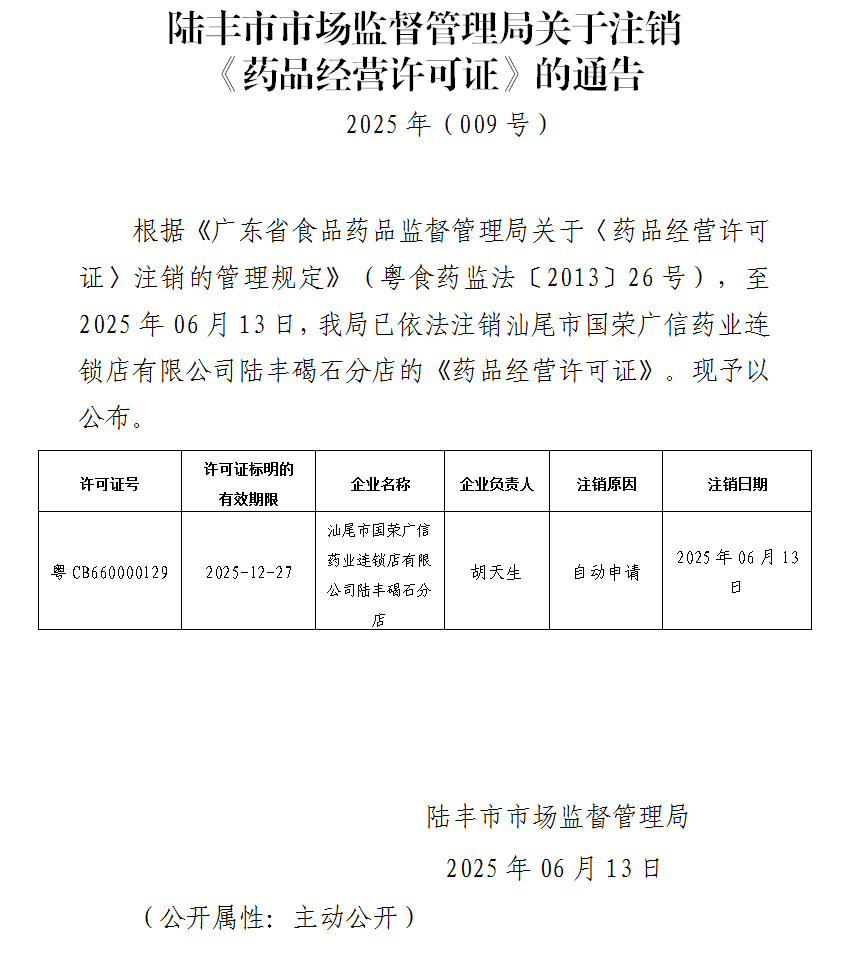 陸豐市市場監(jiān)督管理局關(guān)于注銷《藥品經(jīng)營許可證》的通告