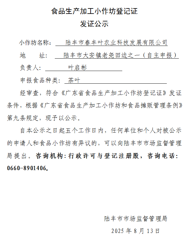 食品生產(chǎn)加工小作坊登記證發(fā)證公示