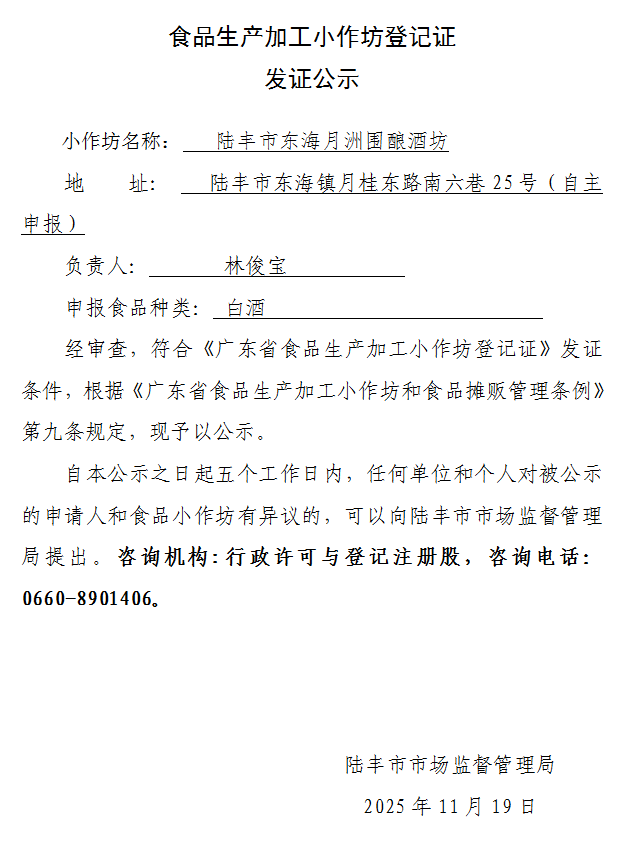 食品生產(chǎn)加工小作坊登記證發(fā)證公示