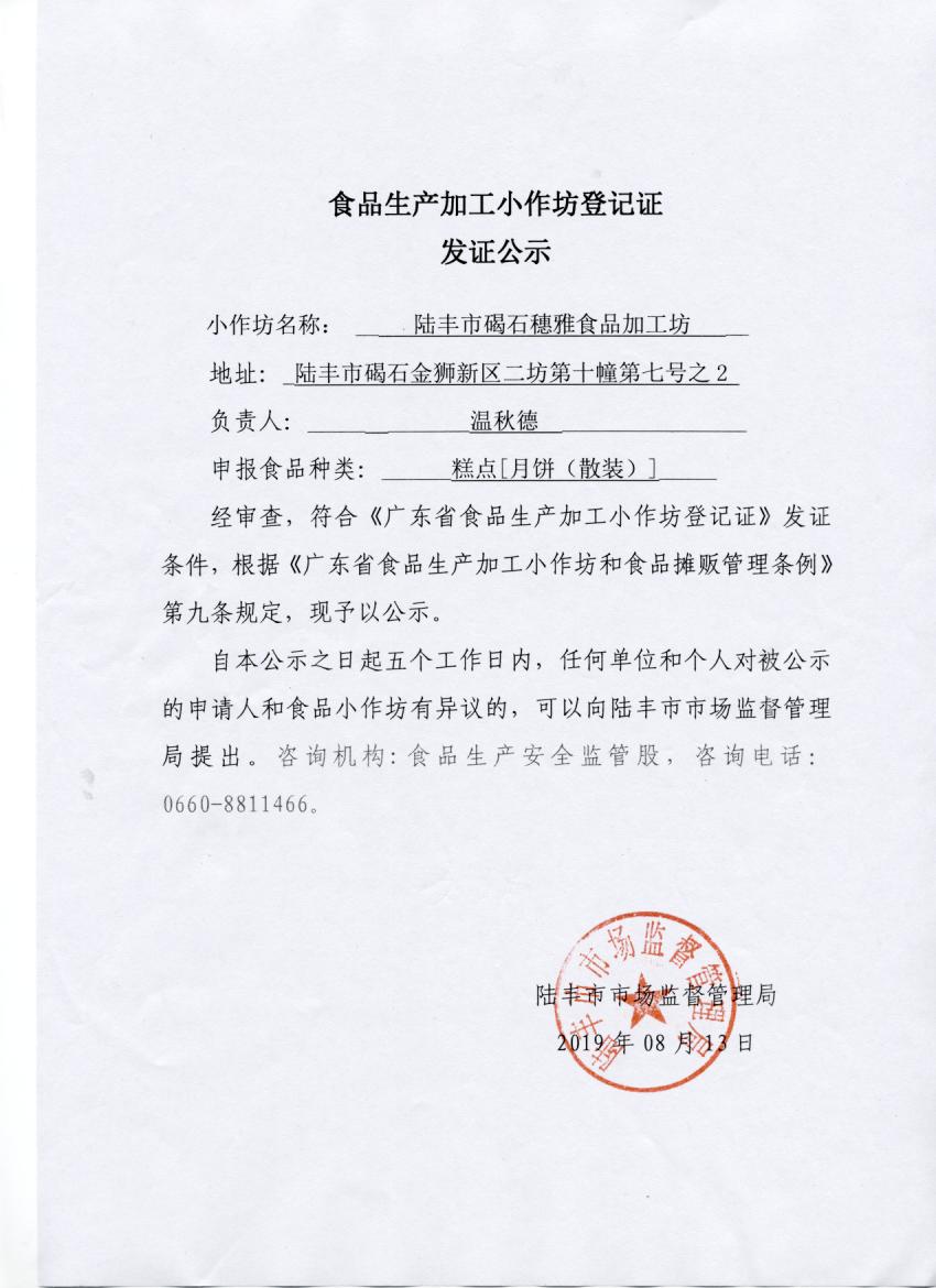 食品生產(chǎn)加工小作坊登記證發(fā)證公示(陸豐市碣石穗雅食品加工坊)
