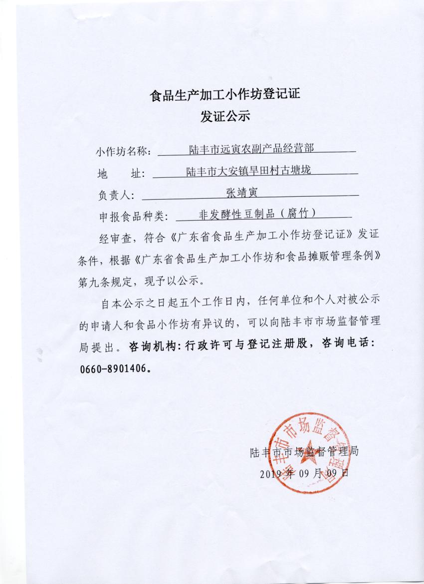 食品生產(chǎn)加工小作坊登記證發(fā)證公示(陸豐市遠寅農(nóng)副產(chǎn)品經(jīng)營部)