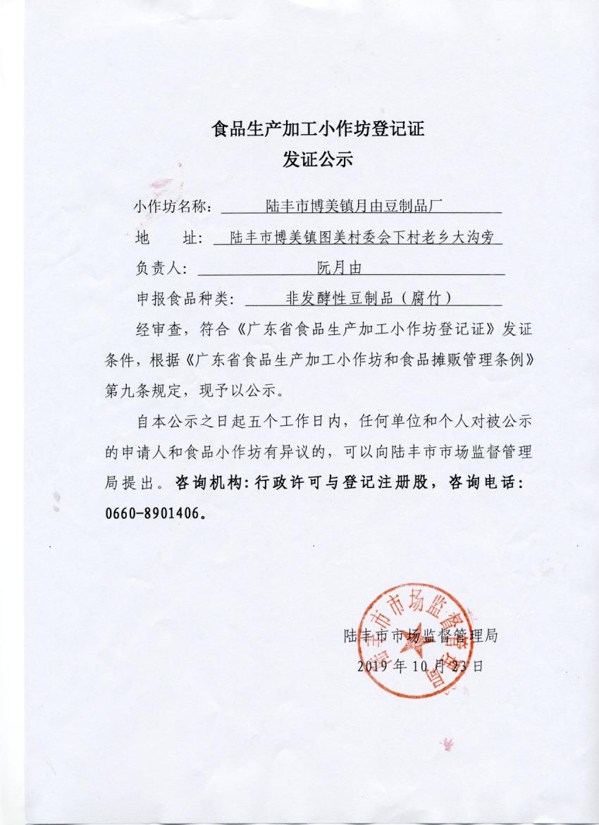 食品生產(chǎn)加工小作坊登記證發(fā)證公示(陸豐市博美鎮(zhèn)月由豆制品廠)