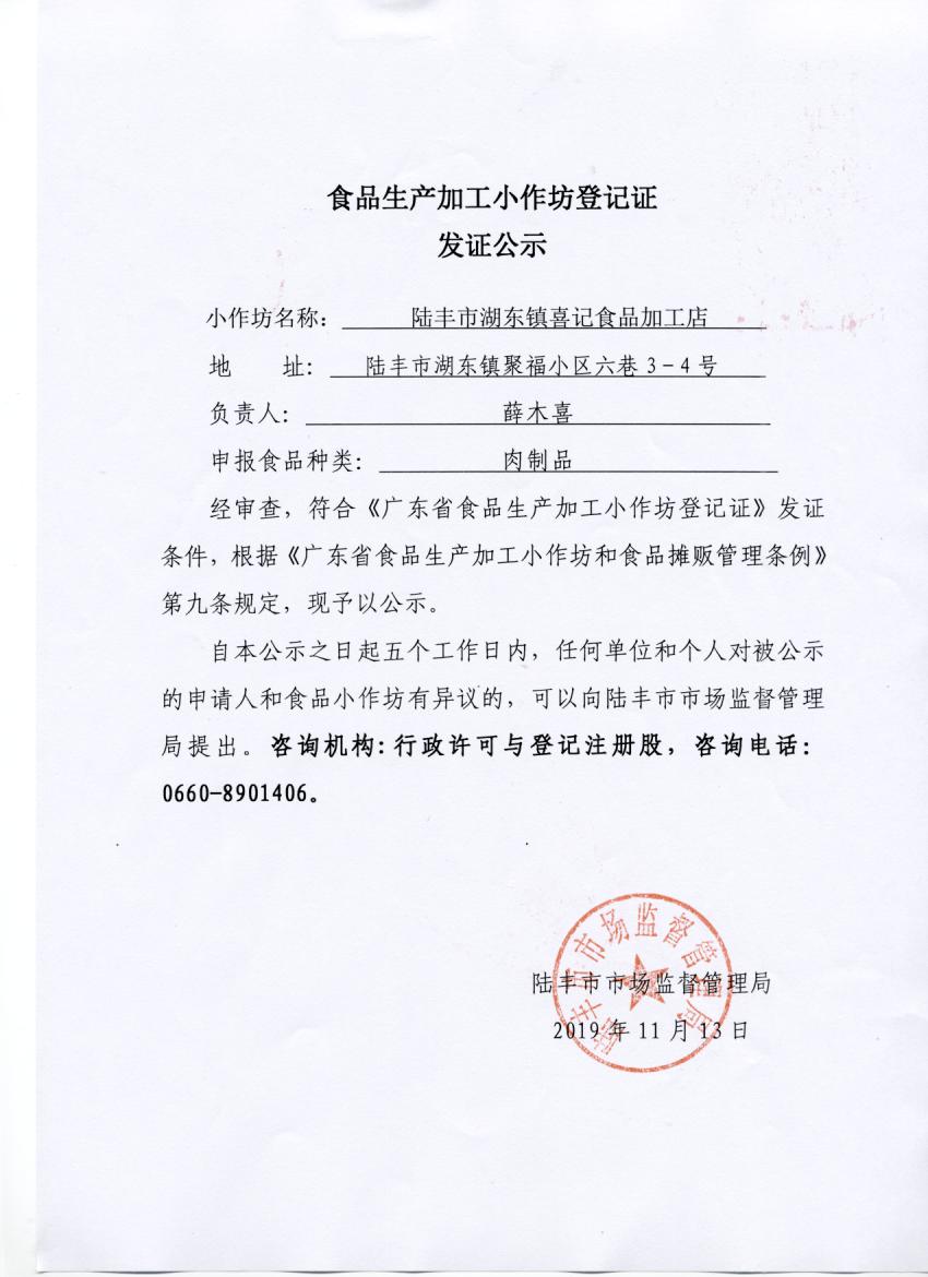 食品生產(chǎn)加工小作坊登記證發(fā)證公示(陸豐市湖東鎮(zhèn)喜記食品加工店)