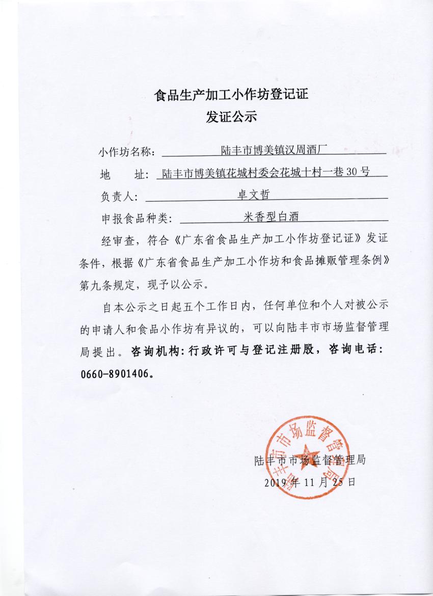 食品生產(chǎn)加工小作坊登記證發(fā)證公示(陸豐市博美鎮(zhèn)漢周酒廠)