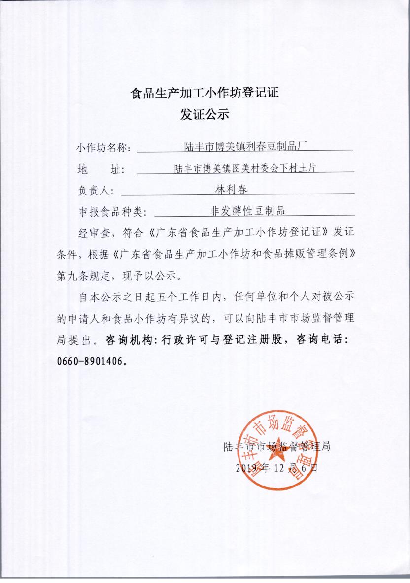 食品生產(chǎn)加工小作坊登記證發(fā)證公示(陸豐市博美鎮(zhèn)利春豆制品廠)