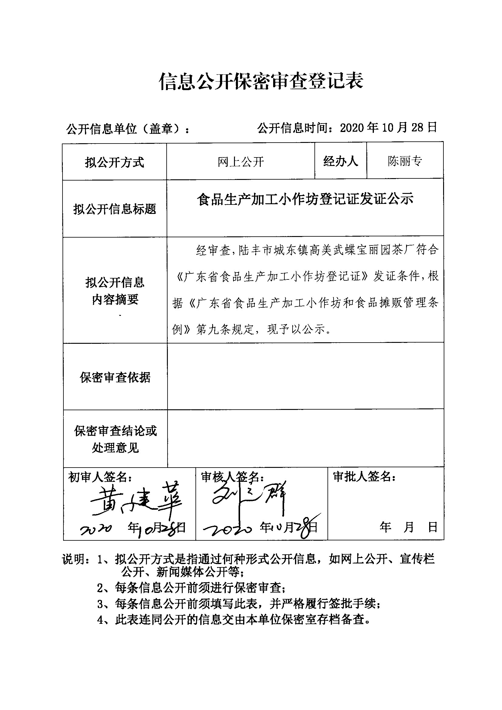 食品生產(chǎn)加工小作坊登記證發(fā)證公示(陸豐市城東高美武蝶山寶麗園茶廠)