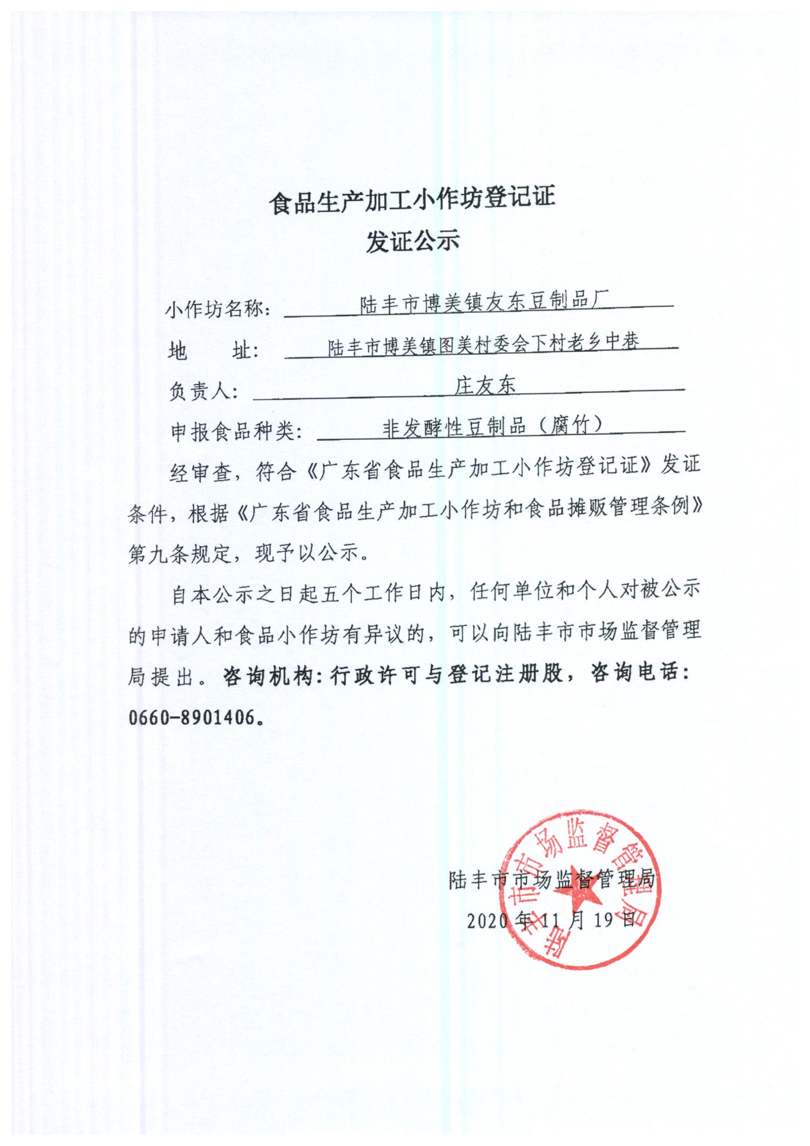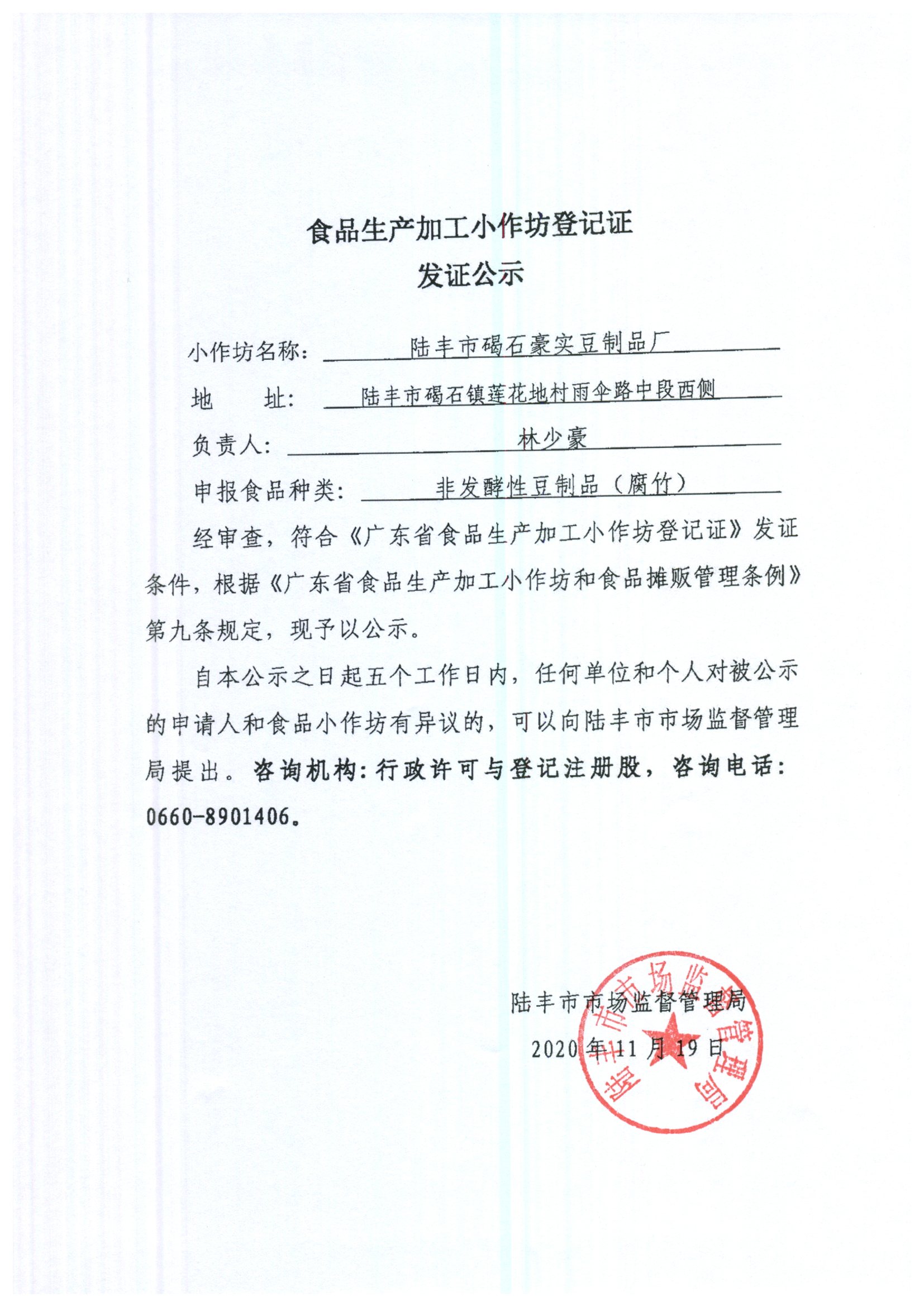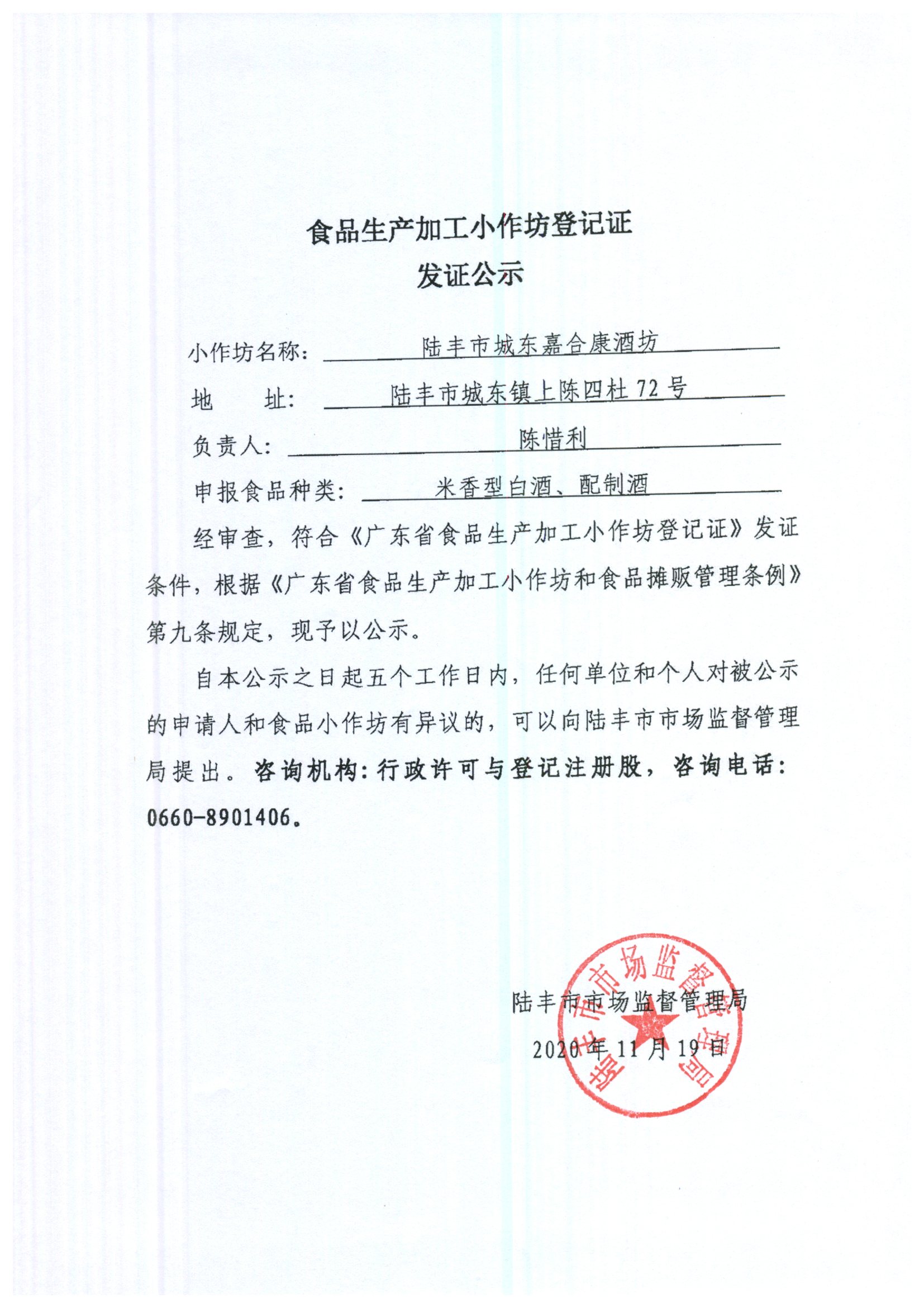 食品加工小作坊登記證發(fā)證公示