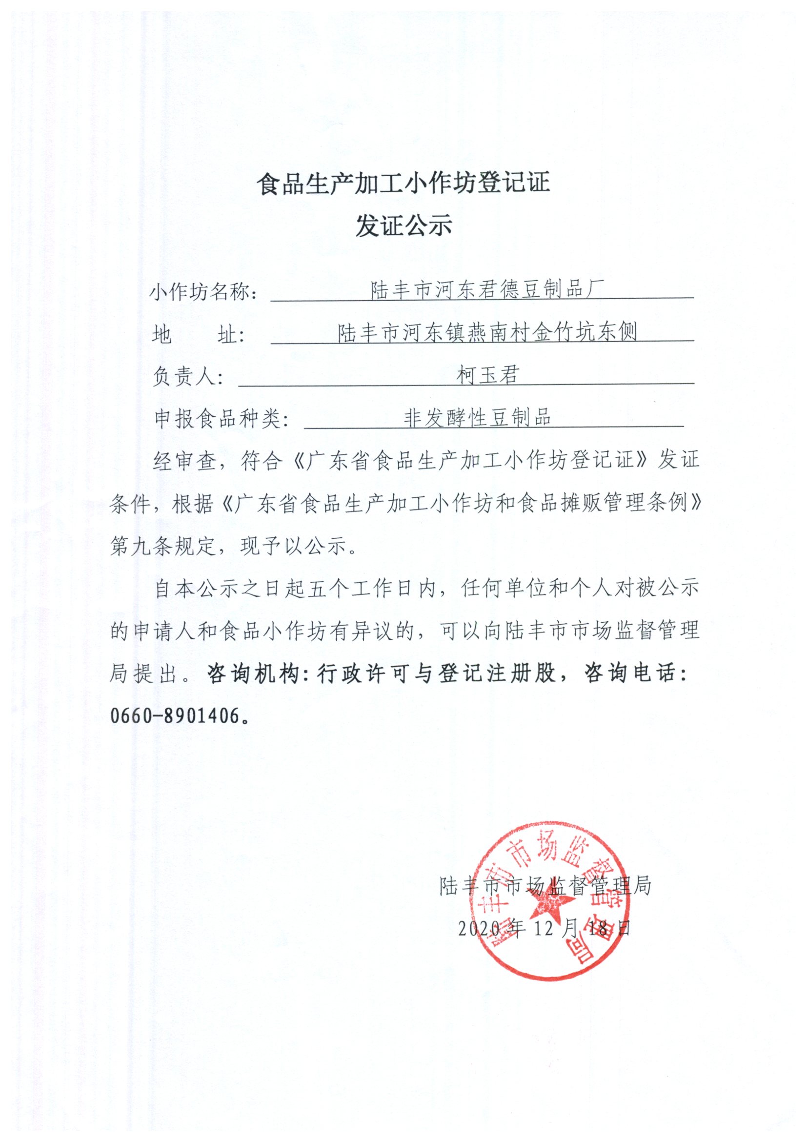 食品生產加工小作坊登記證發(fā)證公示