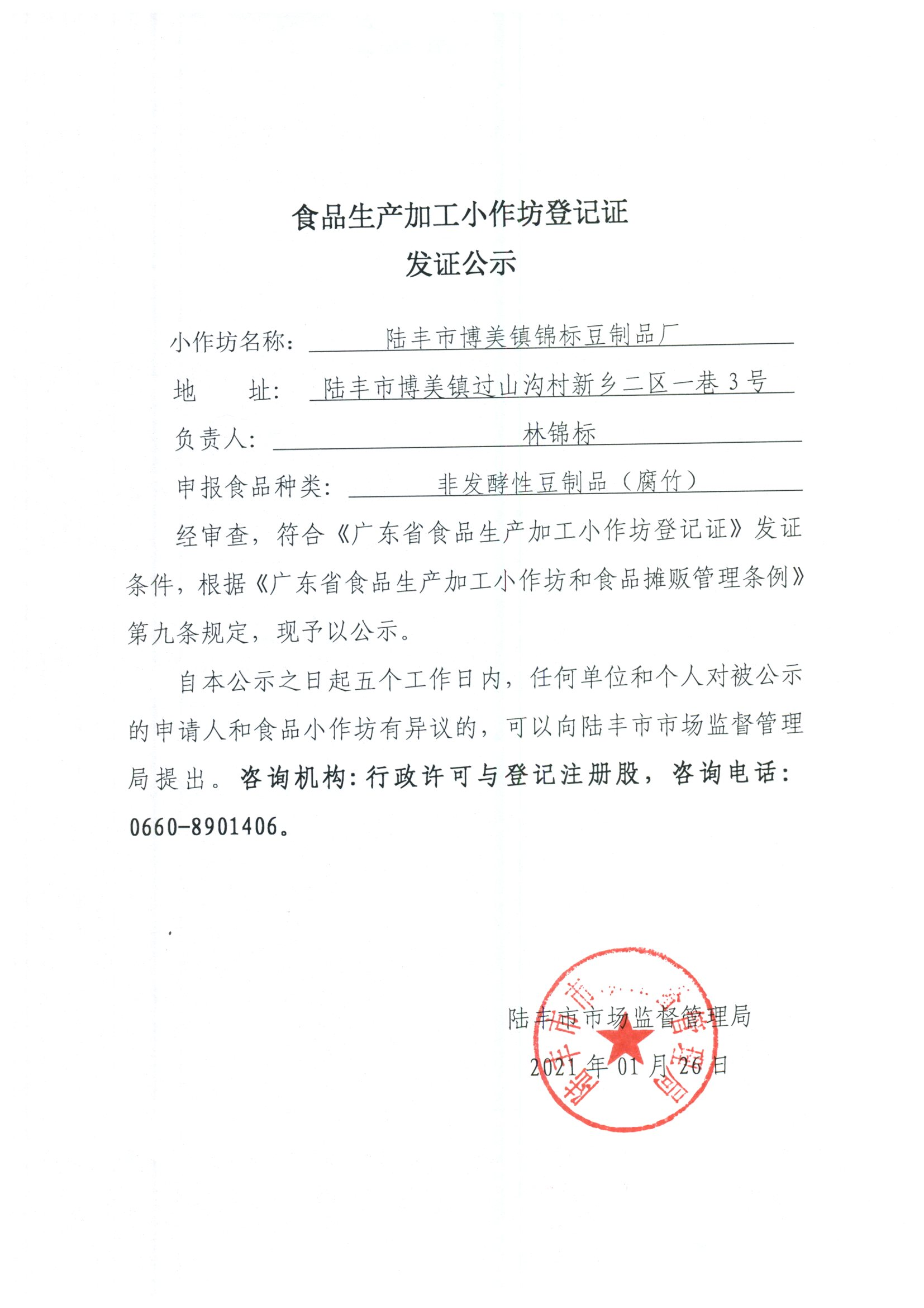 經(jīng)審查,陸豐市博美鎮(zhèn)錦標豆制品廠等3戶小作坊符合《廣東省食品生產(chǎn)加工小作坊登記證》發(fā)證條件,根據(jù)《廣東省食品生產(chǎn)加工小作坊和食品攤販管理條例》第九條規(guī)定,現(xiàn)予以公示。