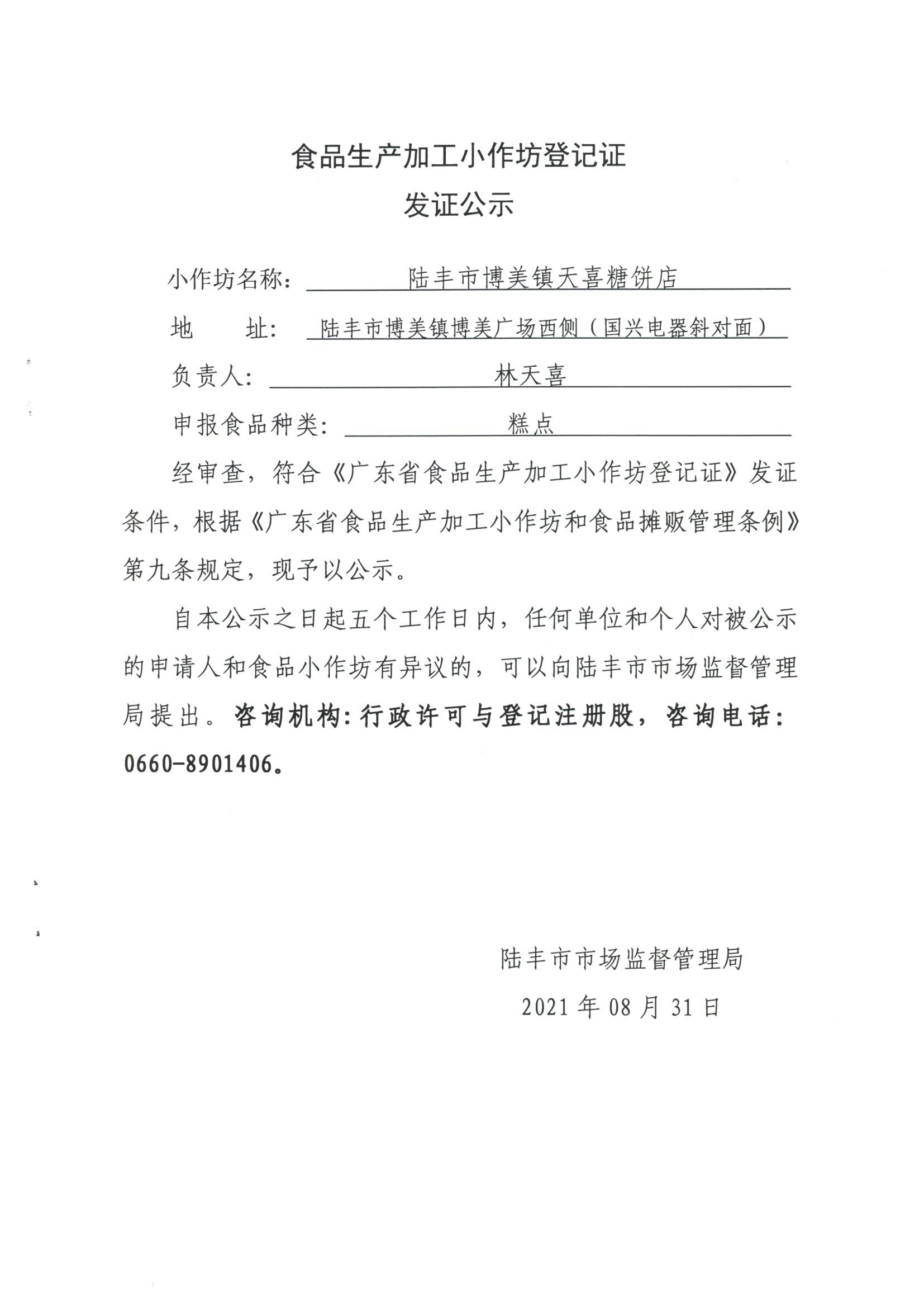 經(jīng)審查,陸豐市博美鎮(zhèn)天喜糖餅店符合《廣東省食品生產(chǎn)加工小作坊登記證》發(fā)證條件,根據(jù)《廣東省食品生產(chǎn)加工小作坊和食品攤販管理條例》第九條規(guī)定,現(xiàn)予以公示。