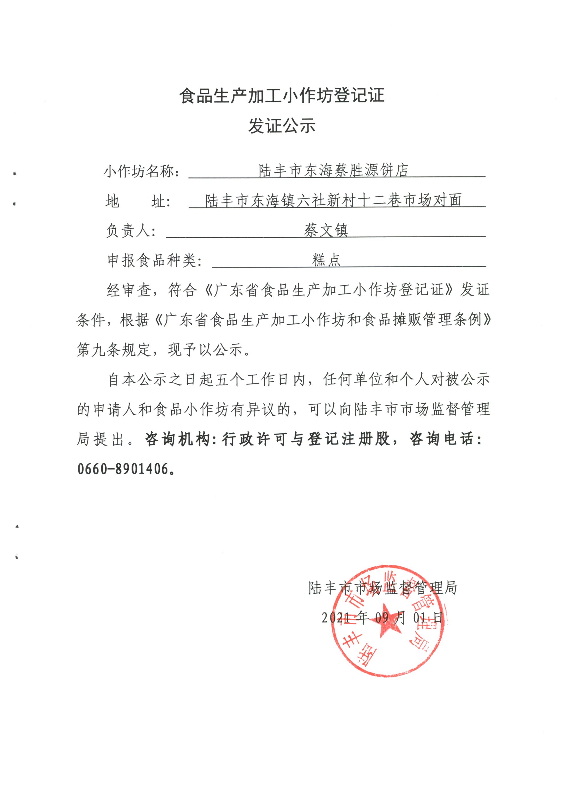 經(jīng)審查,陸豐市東海蔡勝源餅店符合《廣東省食品生產(chǎn)加工小作坊登記證》發(fā)證條件,根據(jù)《廣東省食品生產(chǎn)加工小作坊和食品攤販管理條例》第九條規(guī)定,現(xiàn)予以公示。