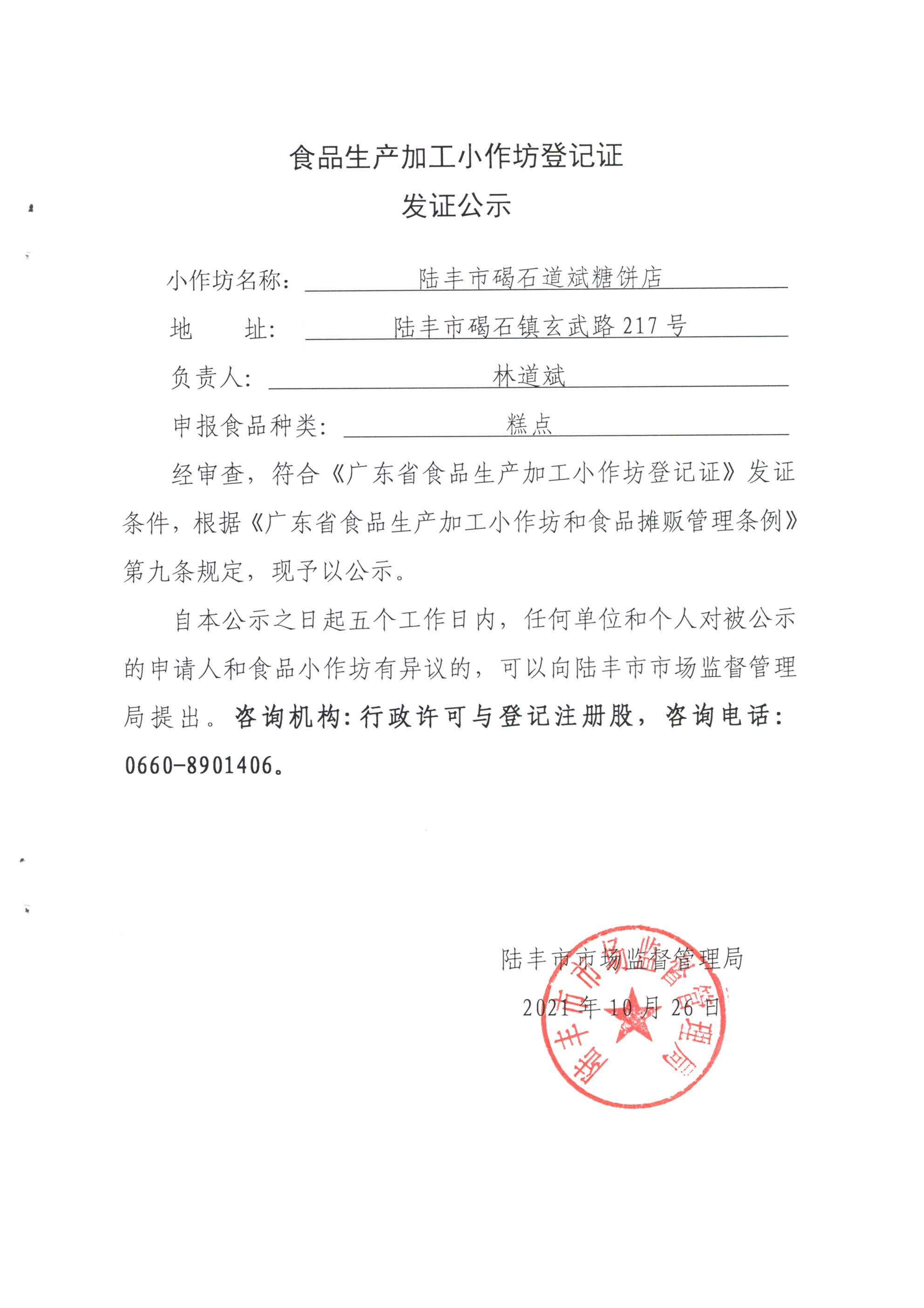 經(jīng)審查,陸豐市碣石道斌糖餅店符合《廣東省食品生產(chǎn)加工小作坊登記證》發(fā)證條件,根據(jù)《廣東省食品生產(chǎn)加工小作坊和食品攤販管理?xiàng)l例》第九條規(guī)定,現(xiàn)予以公示。