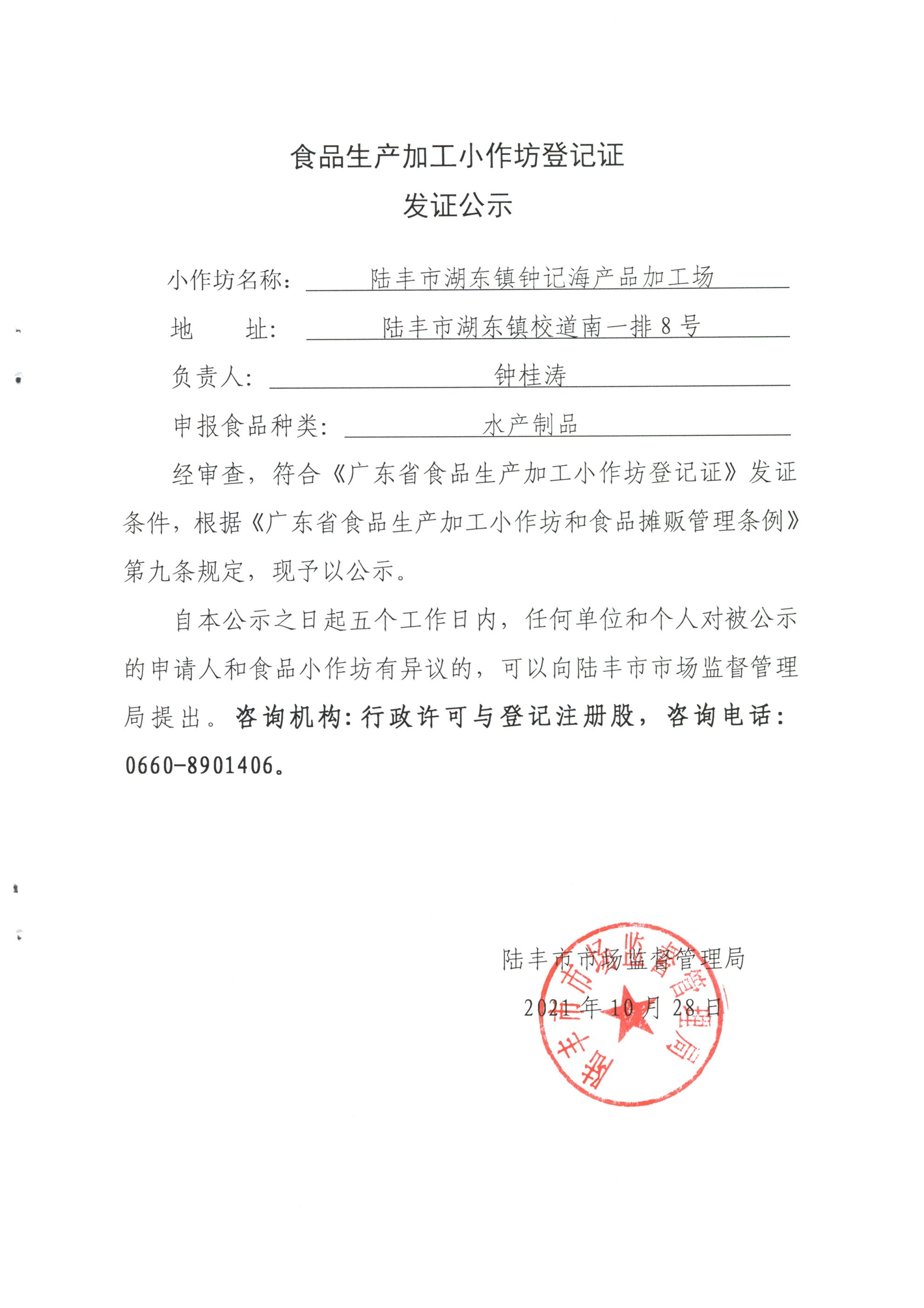 經(jīng)審查,陸豐市湖東鎮(zhèn)鐘記海產(chǎn)品加工場(chǎng)符合《廣東省食品生產(chǎn)加工小作坊登記證》發(fā)證條件,根據(jù)《廣東省食品生產(chǎn)加工小作坊和食品攤販管理?xiàng)l例》第九條規(guī)定,現(xiàn)予以公示。