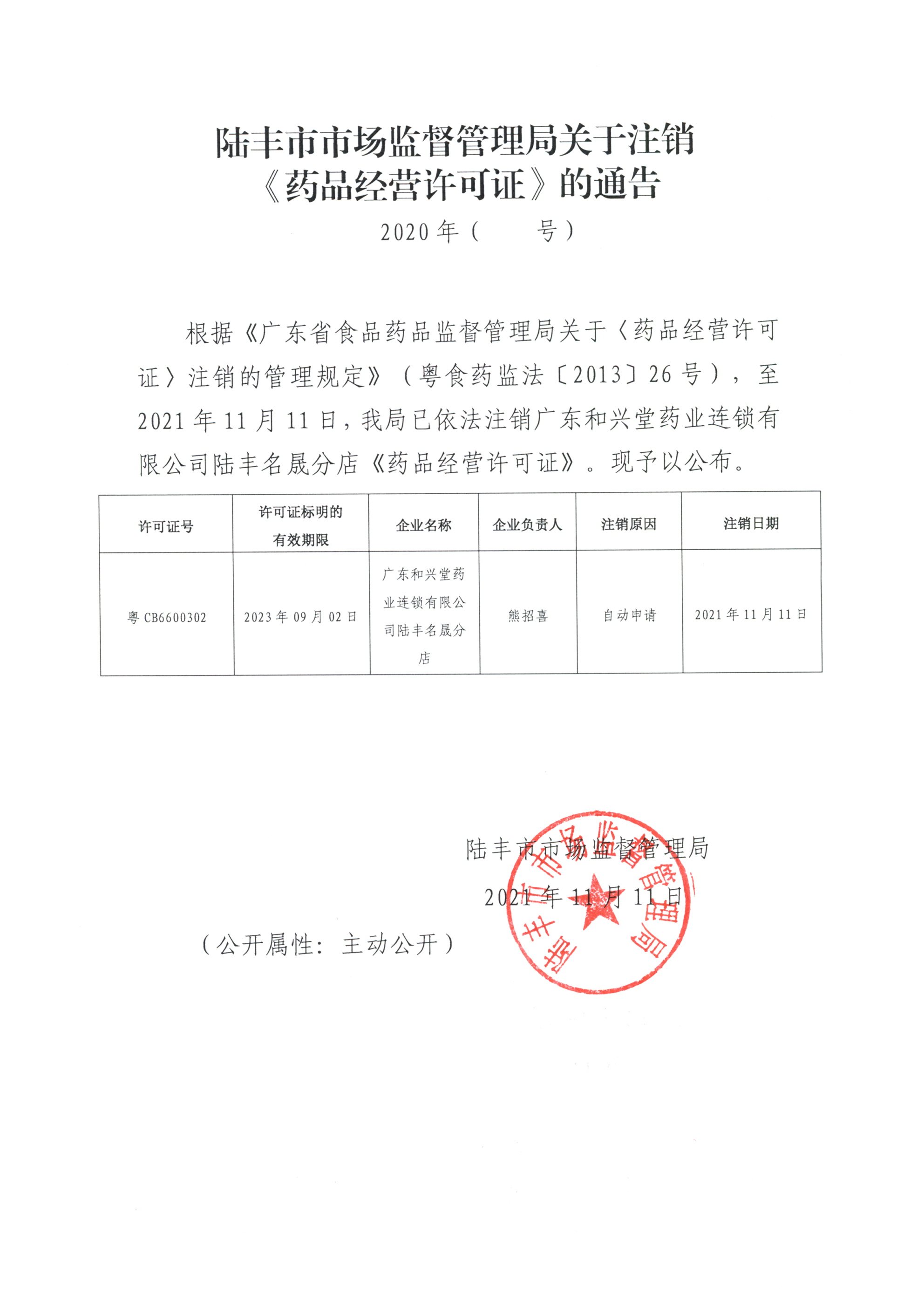 陸豐市市場監(jiān)督管理局關(guān)于注銷《藥品經(jīng)營許可證》的通告