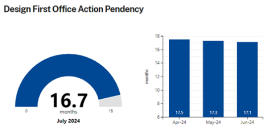 據(jù)悉,美國外觀設(shè)計專利通常比獲得實用新型專利更快,但目前美國的外觀設(shè)計專利申請的審查周期仍然較長。根據(jù)美國專利商標局(USPTO)2024年7月發(fā)布的數(shù)據(jù),在過去一年中,從外觀設(shè)計申請?zhí)峤蝗掌诘降谝淮螌彶橐庖娂某鋈掌诘钠骄鶗r間為16.7個月(下圖1)。在2024年7月,這一平均值已攀升至17.1個月。尤其是在消費品領(lǐng)域,考慮到產(chǎn)品更新?lián)Q代較快,如此長的審查周期可能不適合外觀設(shè)計專利申請人。
