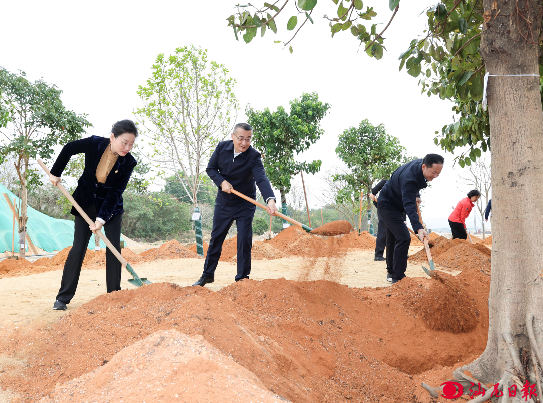 初春的品清湖畔惠風(fēng)和暢、草木同蘇,植樹現(xiàn)場(chǎng)一片繁忙。逯峰、鄭海濤等市領(lǐng)導(dǎo)同志拿起鐵鍬等工具走向植樹點(diǎn),與干部群眾、駐汕部隊(duì)官兵一起,揮鍬鏟土、扶直樹苗、培土圍堰、提水澆灌,合力種下花葉高山榕、黃花風(fēng)鈴木、秋楓等一批特色鄉(xiāng)土喬木。一株株新植樹苗錯(cuò)落有致、迎風(fēng)挺立,為汕尾大地增添了清新綠意和勃勃生機(jī)。