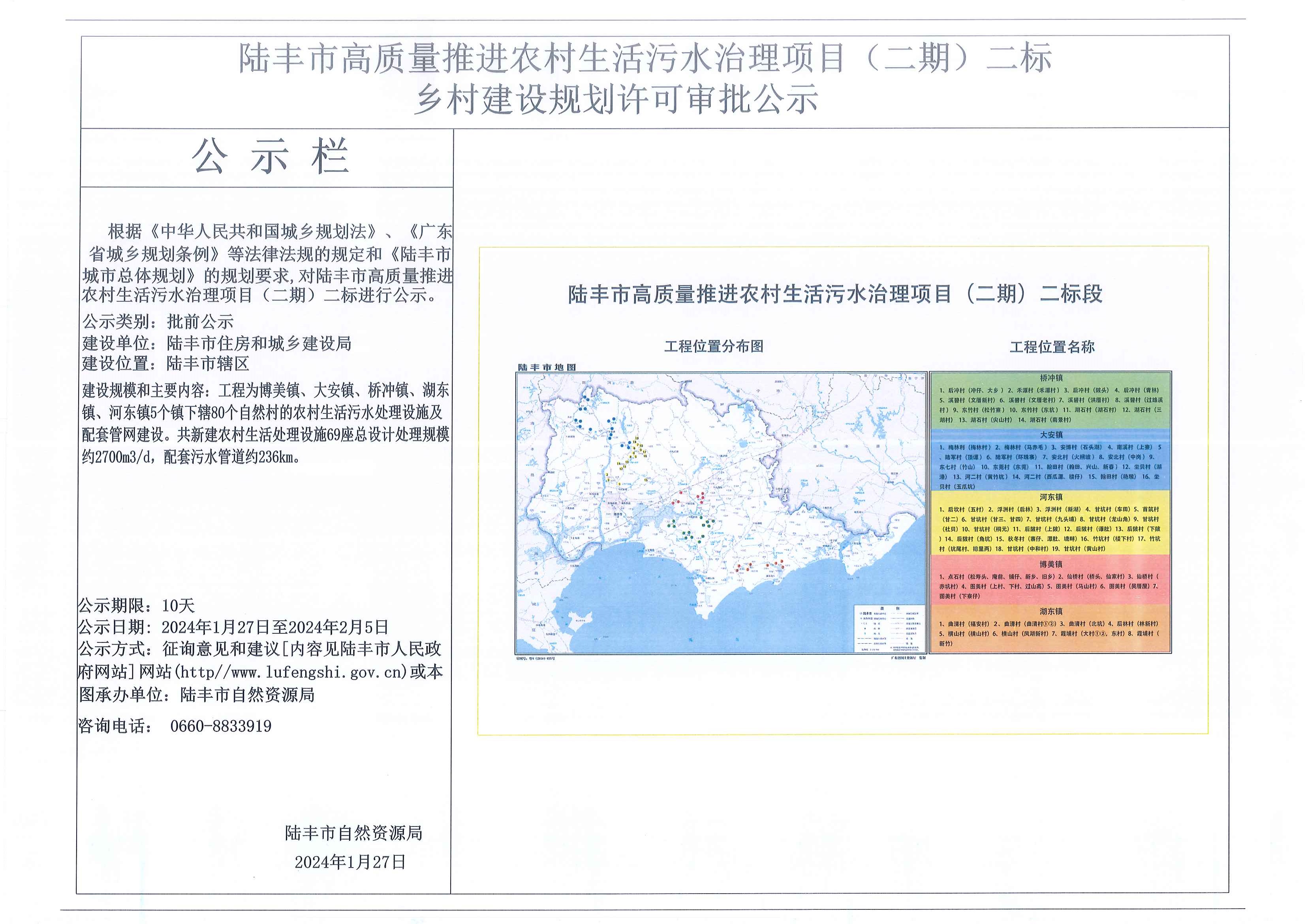 陸豐市高質(zhì)量推進(jìn)農(nóng)村生活污水治理項目 (二期) 二標(biāo)鄉(xiāng)村建設(shè)規(guī)劃許可審批公示