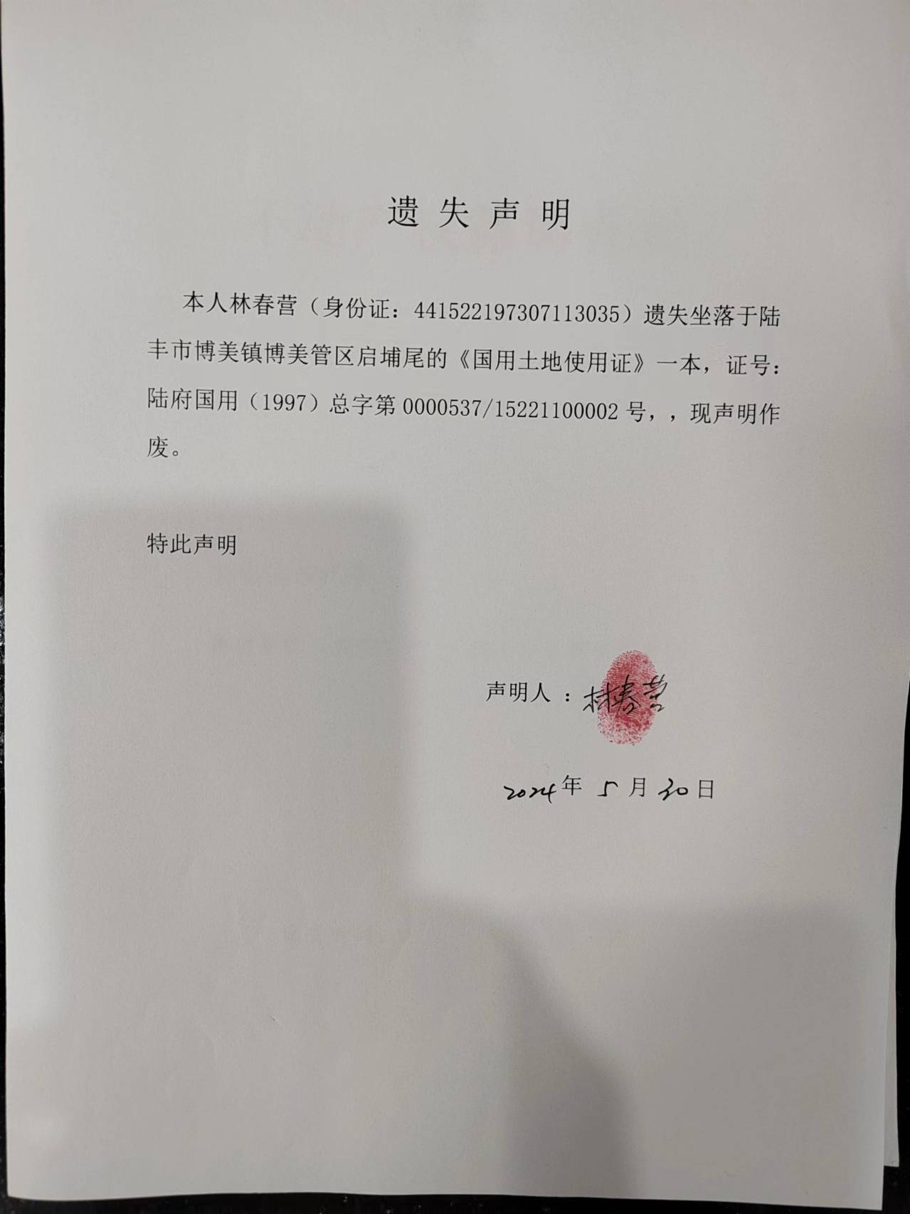 本人林春營(yíng)(身份證:44152219******3035)遺失坐落于陸豐市博美鎮(zhèn)博美管區(qū)啟埔尾的《國(guó)用土地使用證》一本,證號(hào):陸府國(guó)用(1997)總字第0000537/15221100002號(hào),現(xiàn)聲明作廢。