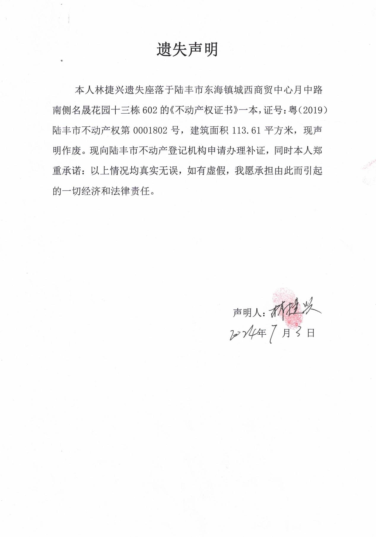 林捷興因保管不善,將下列《不動產(chǎn)權證書》遺失,現(xiàn)向我局申請補發(fā)新證書,根據(jù)《不動產(chǎn)登記暫行條例實施細則》第二十二條的規(guī)定,現(xiàn)公告作廢,如有異議,請自本公告之日起十五個工作日內(2024年8月26日之前)將異議書面材料送達我機構,逾期無人提出異議或者異議不成立的,我機構將予以補證登記。