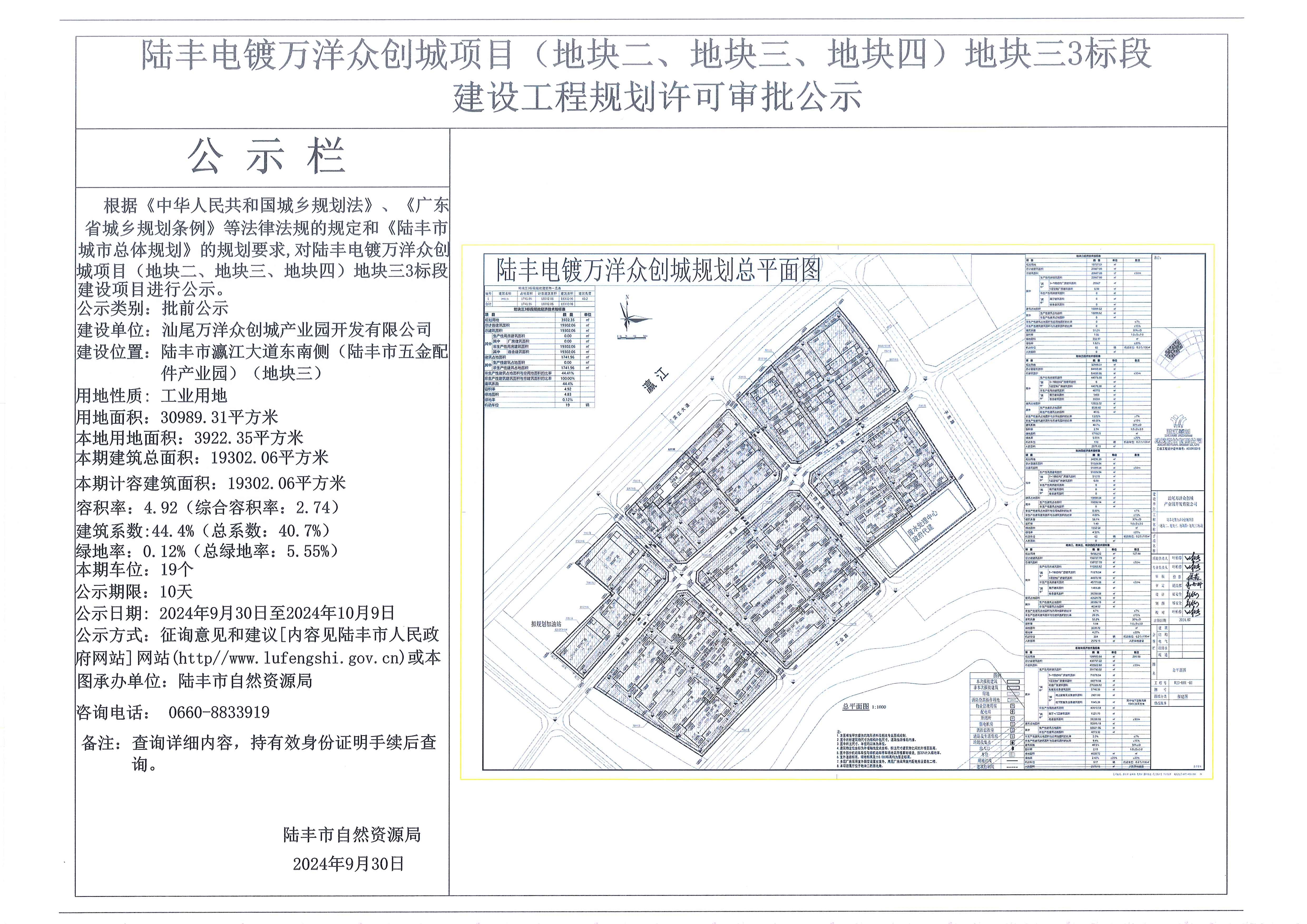 陸豐電鍍萬洋眾創(chuàng)城項目(地塊二、地塊三、地塊四)地塊三3標段建設工程規(guī)劃許可審批公示