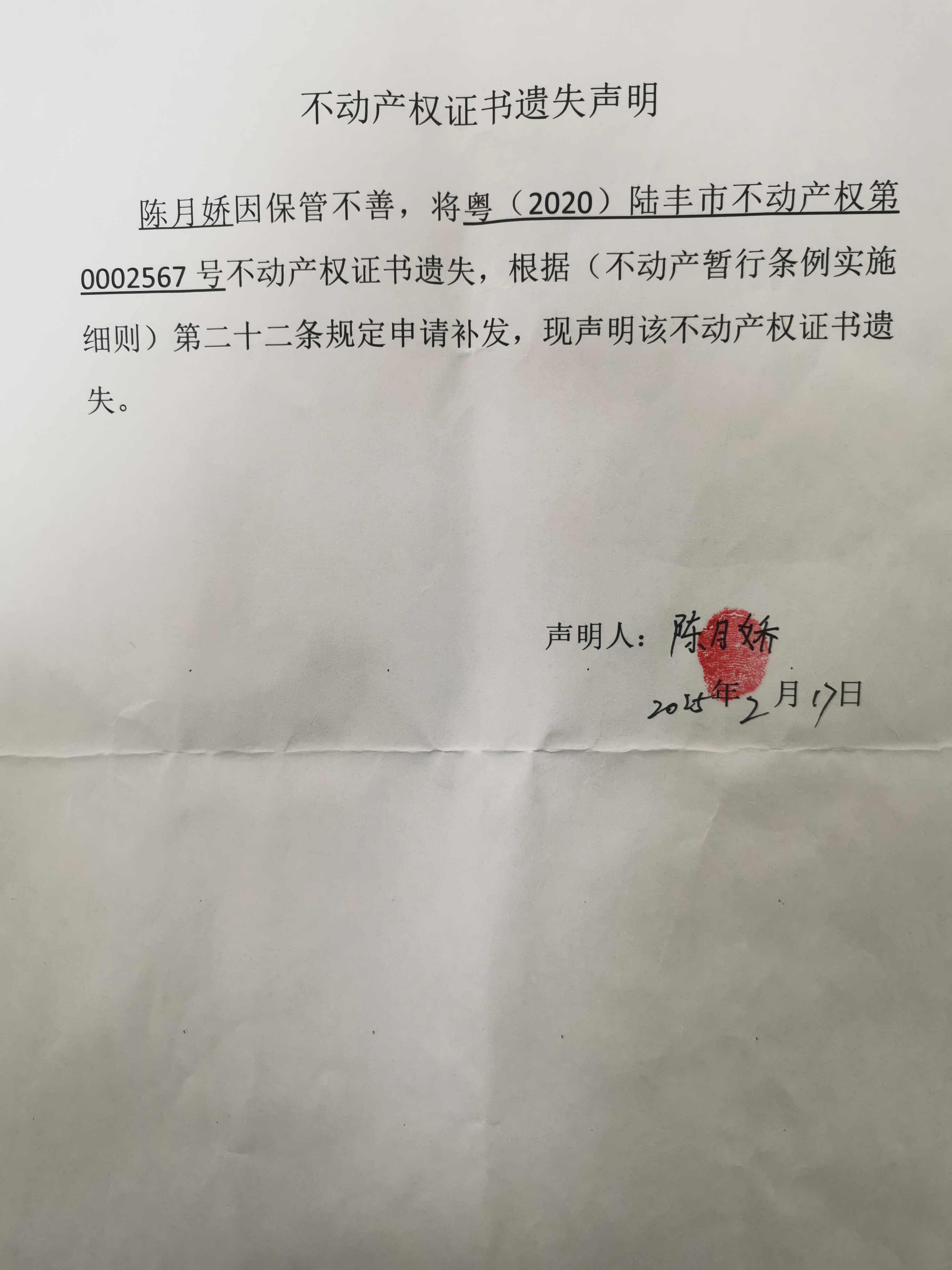 權(quán)利人因《不動產(chǎn)權(quán)證書》遺失,現(xiàn)向我局申請補發(fā)新權(quán)屬證書,根據(jù)《不動產(chǎn)登記暫行條例實施細則》第二十二條的規(guī)定,現(xiàn)公告作廢。我機構(gòu)將按規(guī)定給予補辦理補證登記。