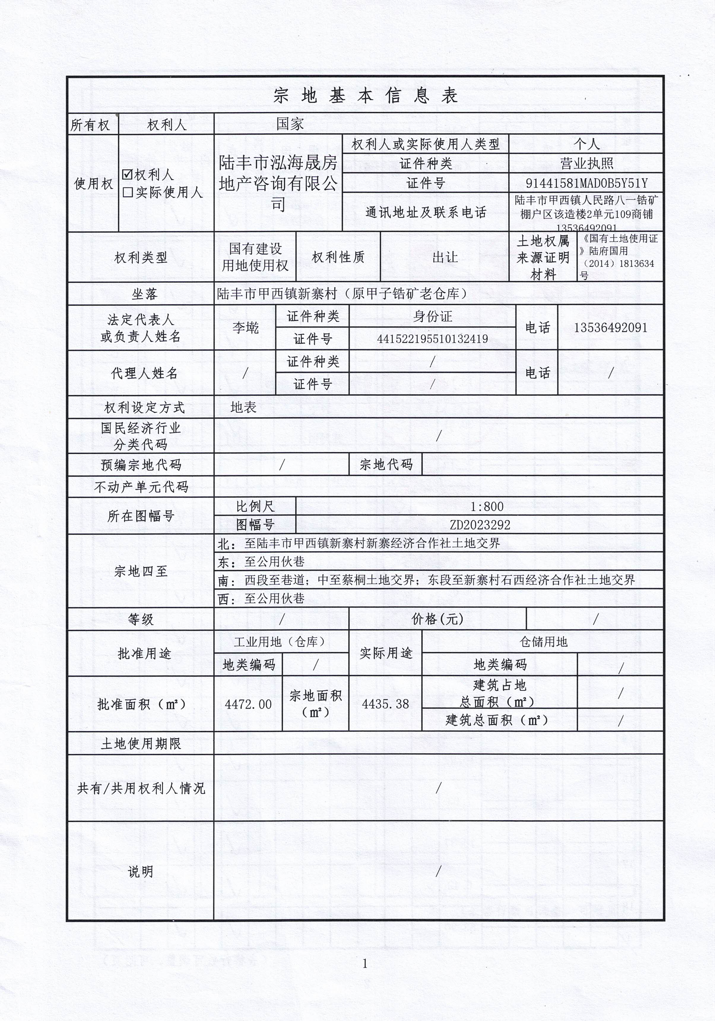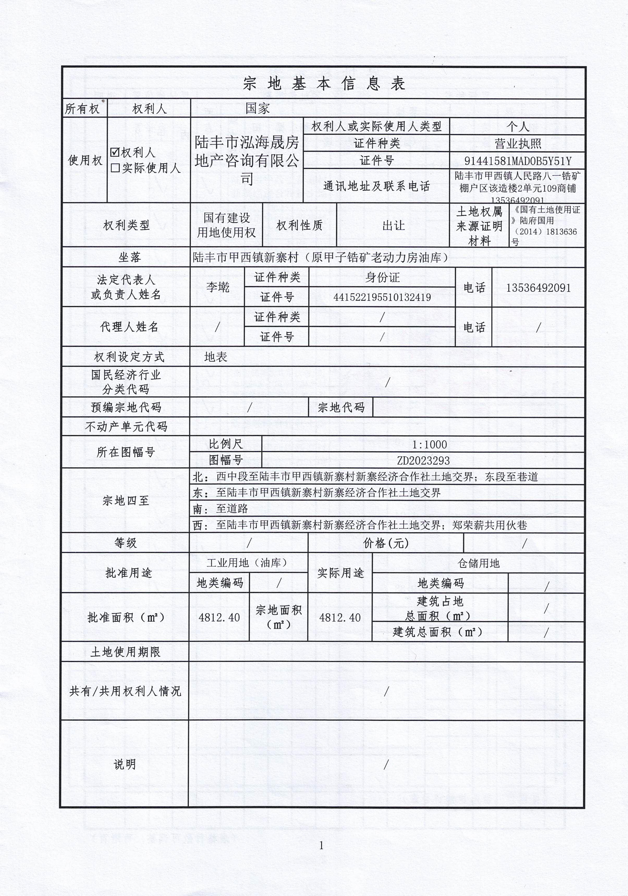 陸豐市華城房地產(chǎn)開(kāi)發(fā)有限公司 | 國(guó)有建設(shè)用地使用權(quán) | 陸豐市甲西鎮(zhèn)新寨村(原甲子鋯礦老動(dòng)力房油庫(kù)) | 東至陸豐市甲西鎮(zhèn)新寨村新寨經(jīng)濟(jì)合作社土地交界;南至道路;西至陸豐市甲西鎮(zhèn)新寨村新寨經(jīng)濟(jì)合作社土地交界、鄭榮薪共用伙巷;北: 西中段至陸豐市甲西鎮(zhèn)新寨村新寨經(jīng)濟(jì)合作社土地交界、東段至巷道 | 4812.40㎡ | 倉(cāng)儲(chǔ)用地 | 附:宗地圖、界 址 簽 章 表 |