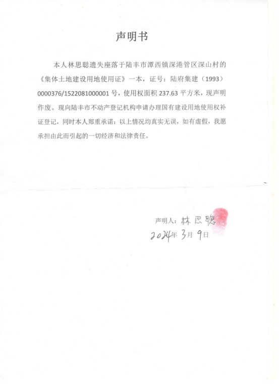 林思聰因《集體土地建設(shè)用地使用證》遺失向我局申請補(bǔ)發(fā)新證書,根據(jù)《不動產(chǎn)登記暫行條例實施細(xì)則》第二十二條的規(guī)定,現(xiàn)公告作廢,如有異議,請自本公告之日起十五個工作日內(nèi)(2025年3月31日之前)將異議書面材料送達(dá)我機(jī)構(gòu),逾期無人提出異議或者異議不成立的,我機(jī)構(gòu)將予以補(bǔ)證登記。