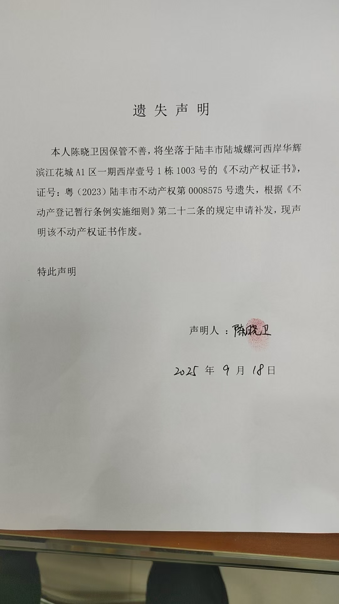本人陳曉衛(wèi)因保管不善,將坐落于陸豐市陸城螺河西岸華輝濱江花城A1區(qū)一期西岸壹號1棟1003號的《不動產(chǎn)權(quán)證書》,證號:粵(2023)陸豐市不動產(chǎn)權(quán)第0008575號遺失,根據(jù)《不動產(chǎn)登記暫行條例實施細(xì)則》第二十二條的規(guī)定申請補發(fā),現(xiàn)聲明該不動產(chǎn)權(quán)證書作廢。