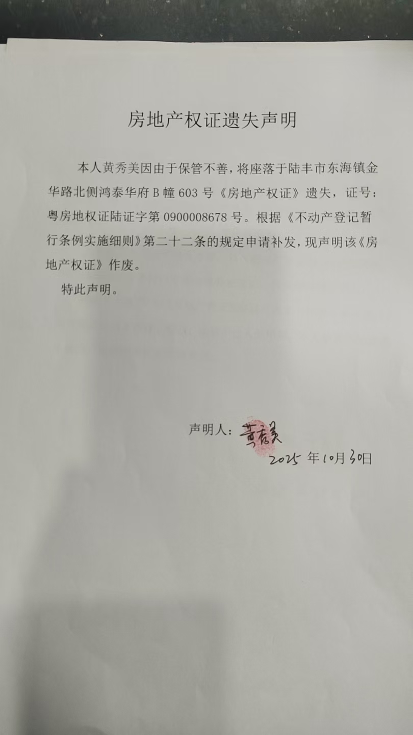 遺失聲明:本人黃秀美因由于保管不善,將座落于陸豐市東海鎮(zhèn)金華路北側(cè)鴻泰華府B幢603號(hào)《房地產(chǎn)權(quán)證》遺失,證號(hào):粵房地權(quán)證陸證字第0900008678號(hào)。根據(jù)《不動(dòng)產(chǎn)登記暫行條例實(shí)施細(xì)則》第二十二條的規(guī)定申請(qǐng)補(bǔ)發(fā),現(xiàn)聲明該《房地產(chǎn)權(quán)證》作廢。