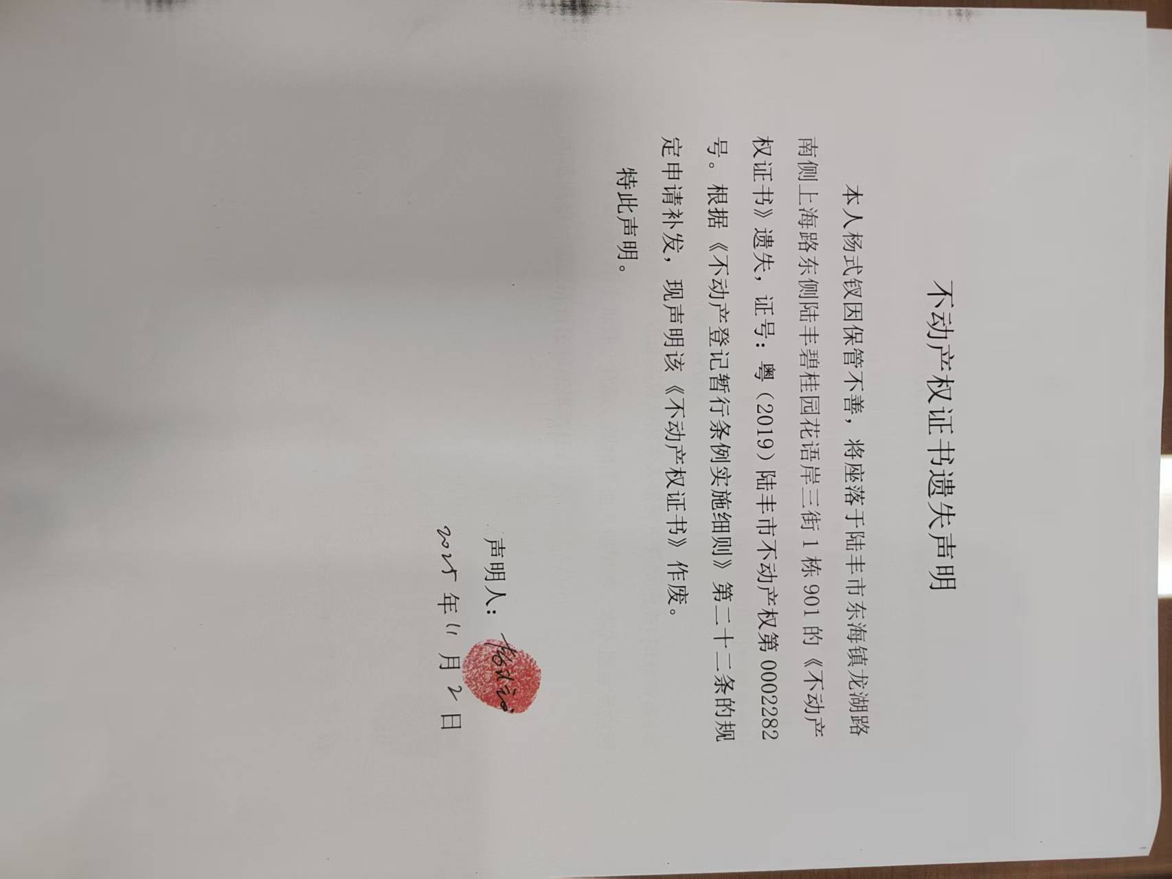 遺失聲明:本人楊式釵因由于保管不善,將座落于陸豐市東海鎮(zhèn)龍湖路南側(cè)上海路東側(cè)陸豐碧桂園花語岸三街1棟901的《不動(dòng)產(chǎn)權(quán)證書》遺失,證號(hào):粵(2019)陸豐市不動(dòng)產(chǎn)權(quán)第0002282號(hào)。根據(jù)《不動(dòng)產(chǎn)登記暫行條例實(shí)施細(xì)則》第二十二條的規(guī)定申請(qǐng)補(bǔ)發(fā),現(xiàn)聲明該《不動(dòng)產(chǎn)權(quán)證書》作廢。