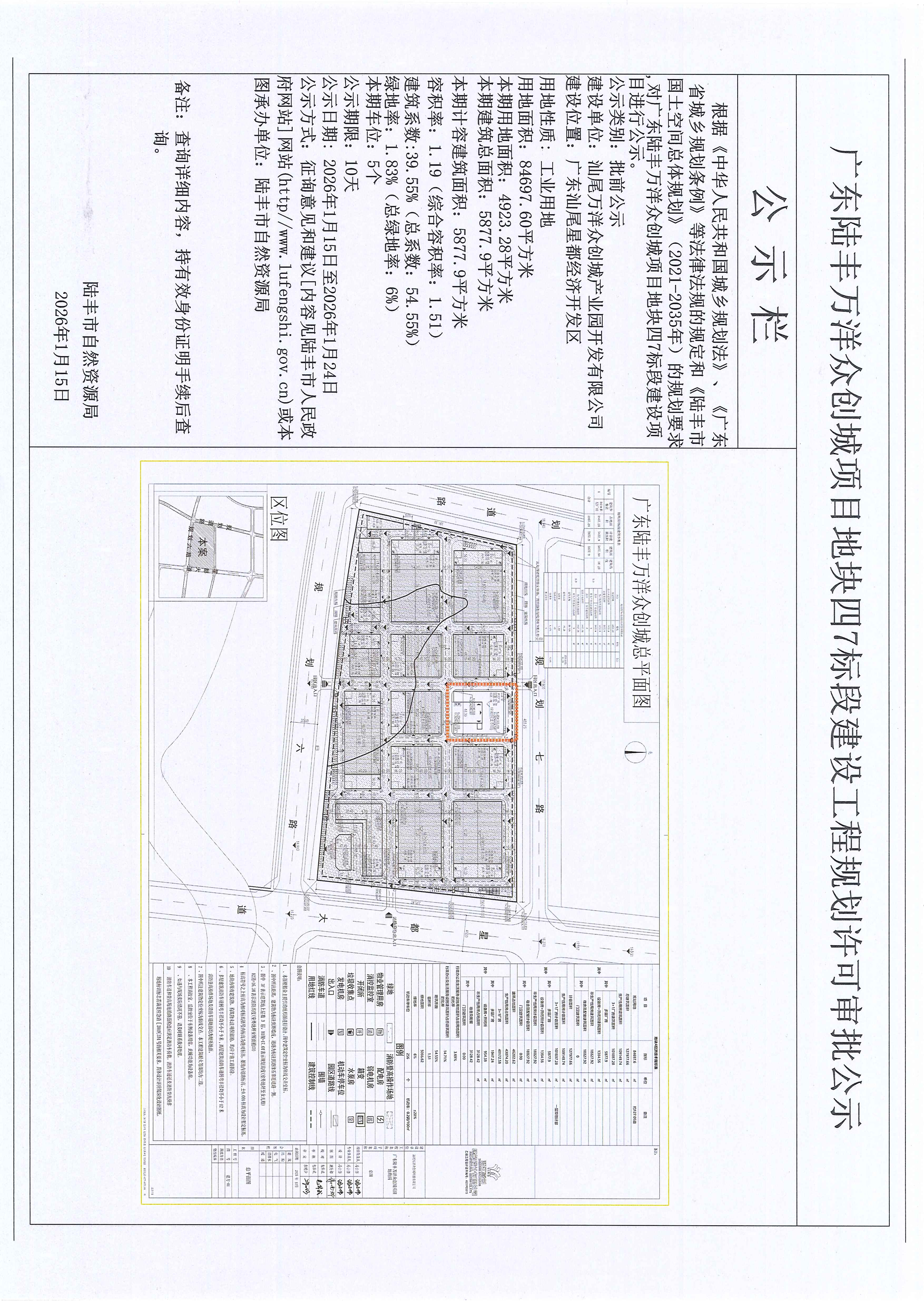 廣東陸豐萬洋眾創(chuàng)城項目地塊四7標段建設工程規(guī)劃許可審批公示